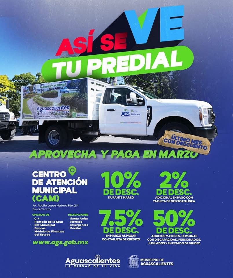 El Municipio de Aguascalientes invita a la ciudadanía a aprovechar los últimos días del 10 por ciento de descuento por pronto pago de la campaña 2025 “Así se ve tu Predial”, la cual estará vigente hasta el próximo 31 de marzo de 2025.