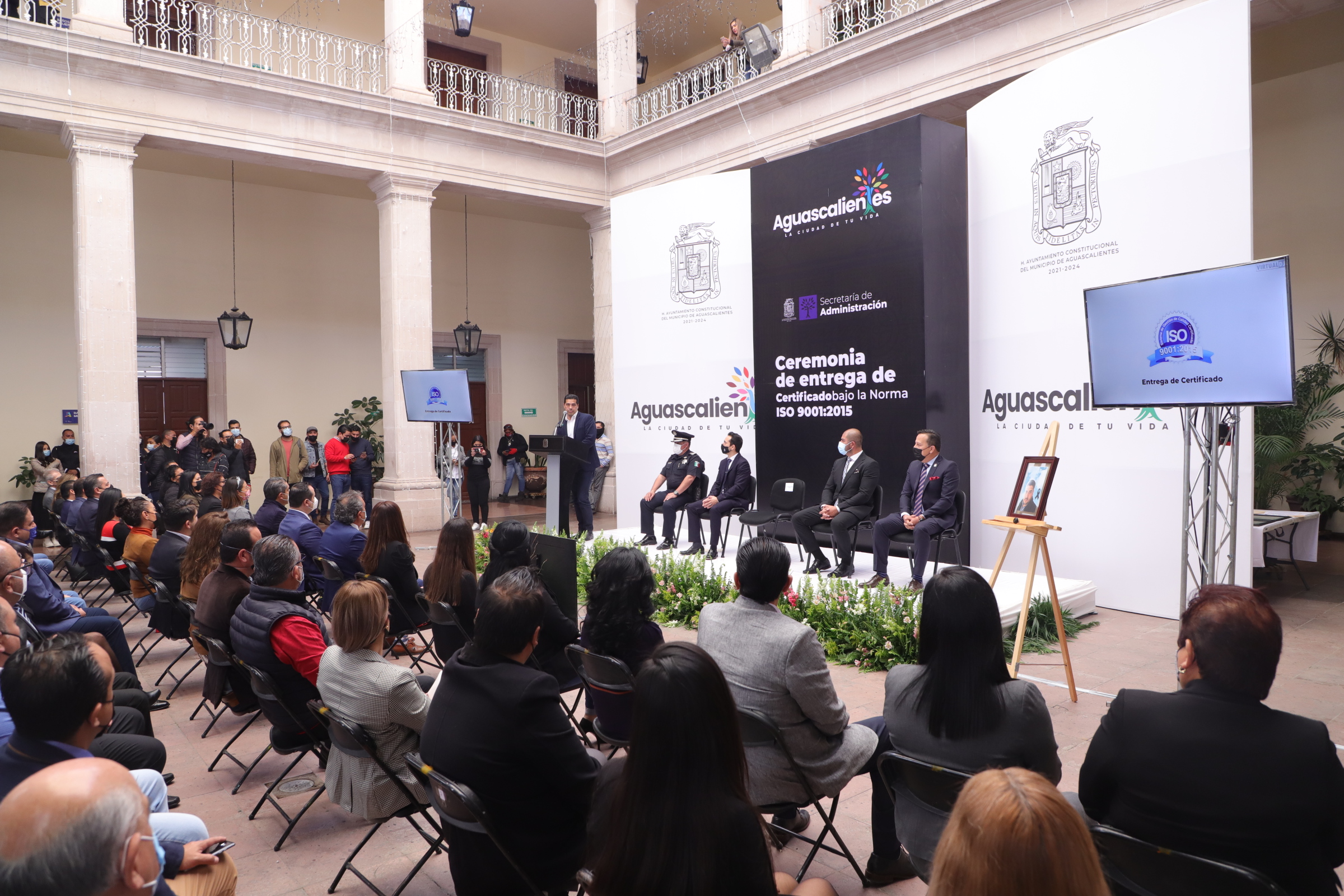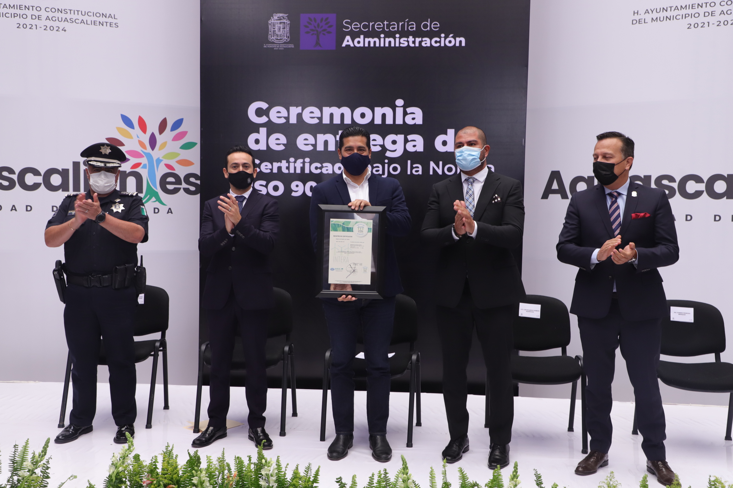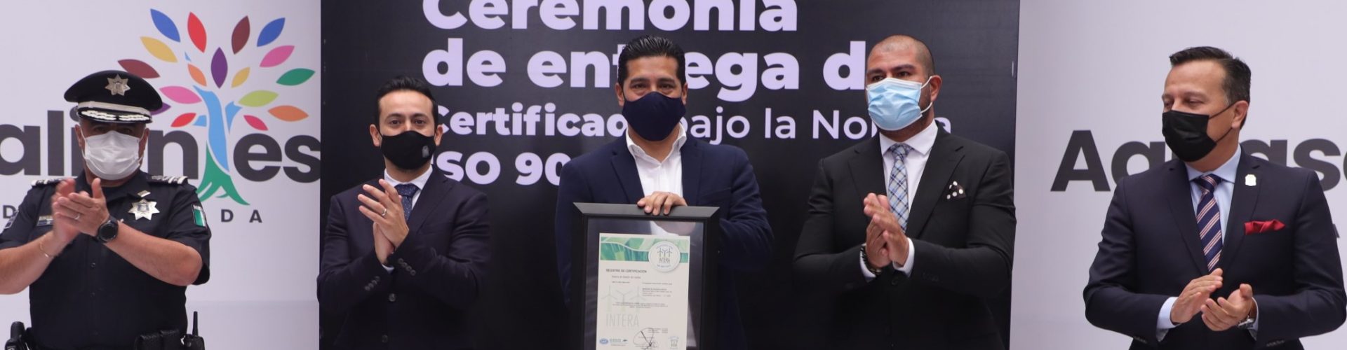 El presidente municipal de Aguascalientes, Leonardo Montañez acompañado por Christian Gutiérrez Márquez, secretario de Administración; Ramiro Pedroza Márquez, coordinador de Gobierno Digital y Antonio Martínez Romo, titular de Seguridad Pública Municipal, recibió la certificación bajo la Norma ISO 9001:2015 del Sistema de Gestión de Calidad otorgada por la empresa Inter Americas Standars Services.