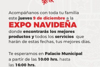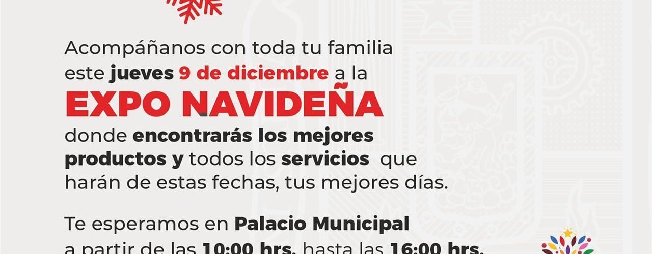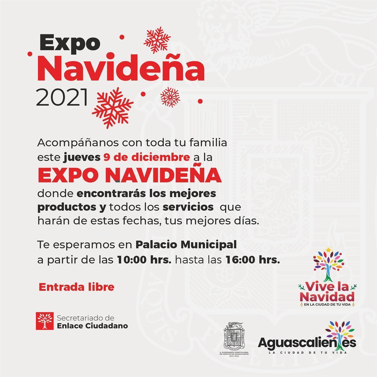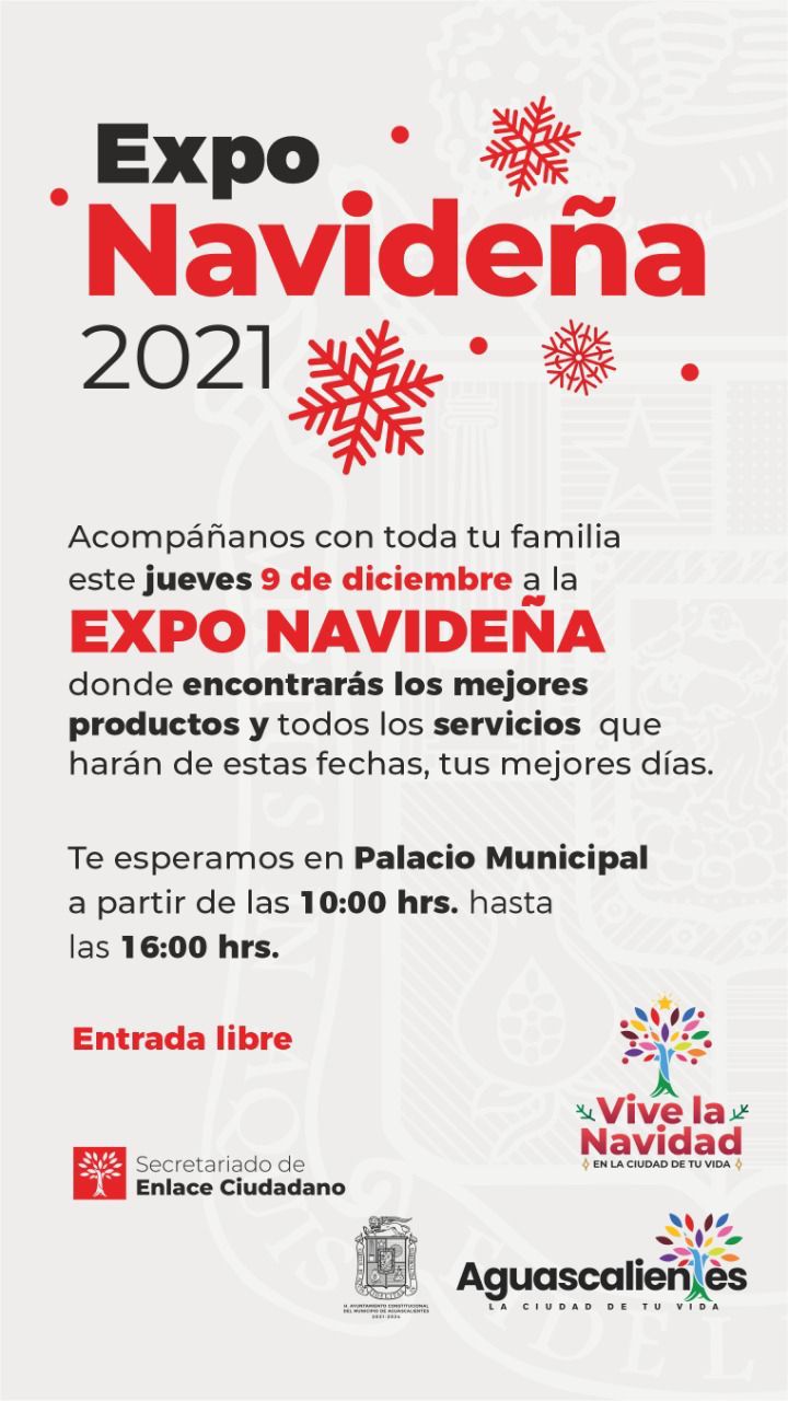 Con el fin de impulsar el consumo local y el emprendimiento, la Presidencia Municipal de Aguascalientes a través del Secretariado de Enlace Ciudadano invita a la ciudadanía a adquirir sus obsequios para las festividades decembrinas en la “Expo Navideña 2021”, el próximo jueves 9 de diciembre a partir de las 10:00 de la mañana y hasta las 16:00 horas en Palacio Municipal.