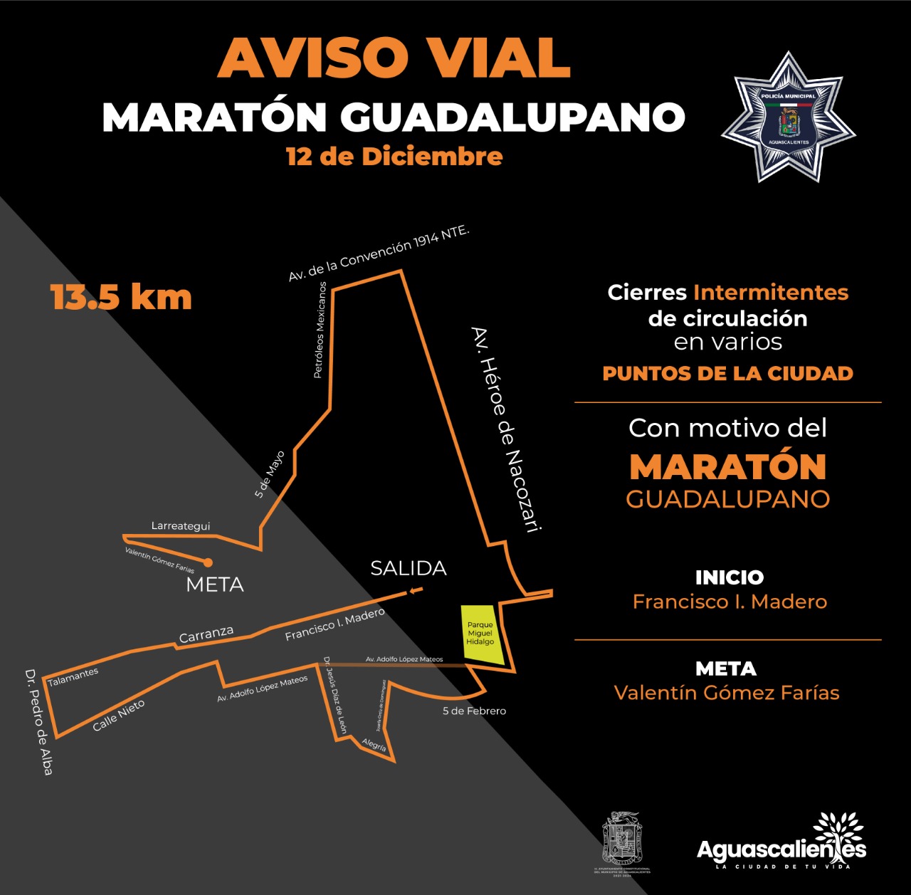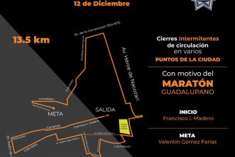La Secretaría de Seguridad Pública Municipal de Aguascalientes (SSPM) informa que con motivo del Maratón Guadalupano 2021 que se realizará este domingo 12 de diciembre, habrá cierres de circulación vehicular en calles del centro y el primer cuadro de la ciudad.