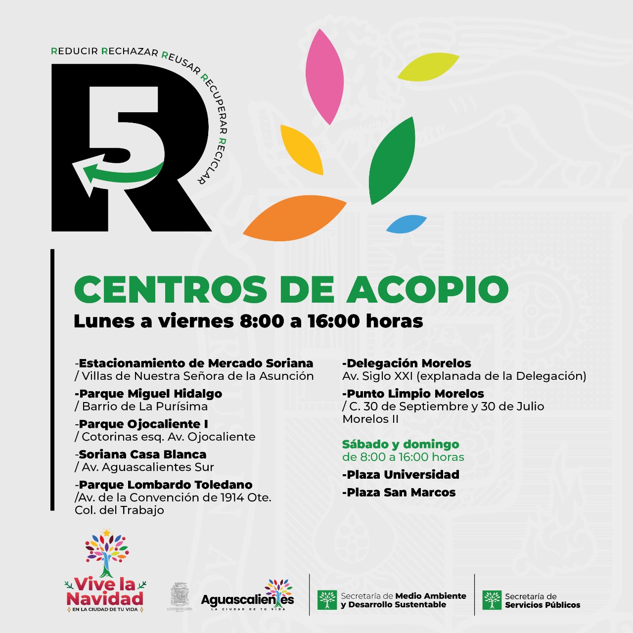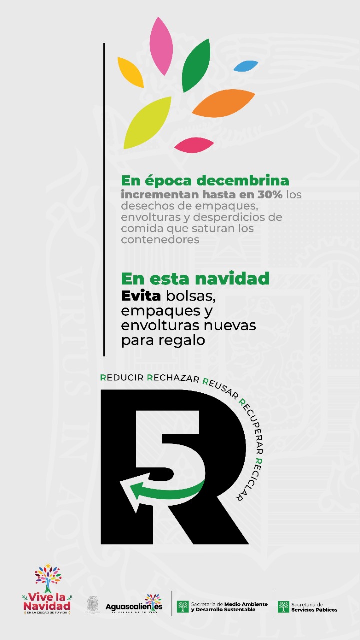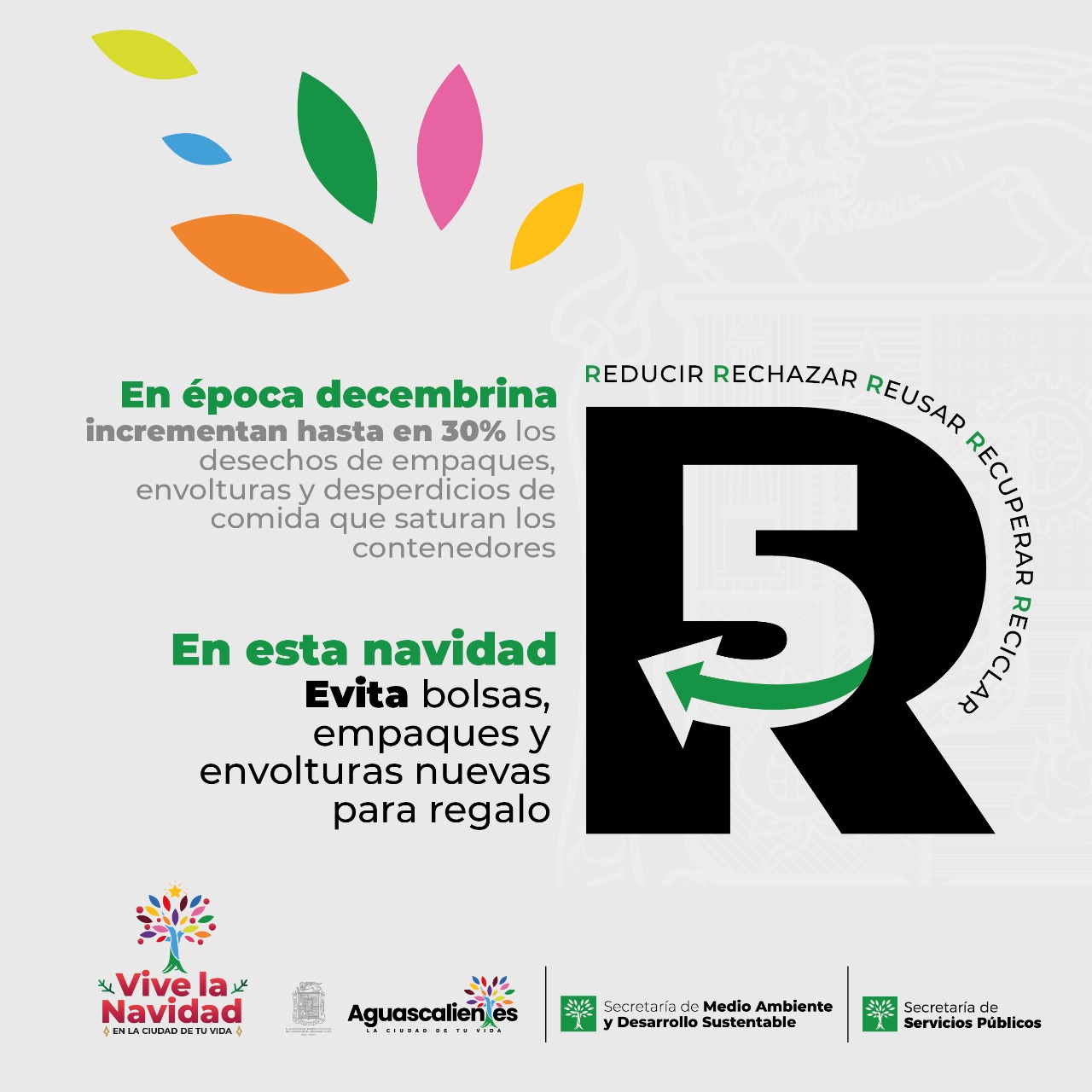 El Municipio de Aguascalientes a través de la Secretaría de Servicios Públicos (SSP) y la Secretaría de Medio Ambiente y Desarrollo Sustentable, lanza la campaña “En esta Navidad”, mediante la cual se intensifican las acciones “5´R” (Reducir, Rechazar, Reusar, Recuperar y Reciclar), para cuidar el medio ambiente y evitar la contaminación.