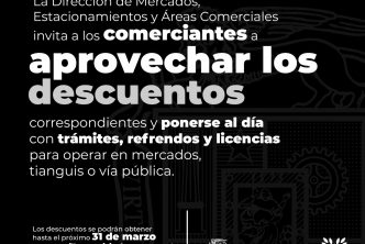 La Dirección de Mercados, Estacionamientos y Áreas Comerciales, invita a los comerciantes a aprovechar los descuentos correspondientes y ponerse al día con trámites, refrendos y licencias para operar en mercados, tianguis o vía pública.