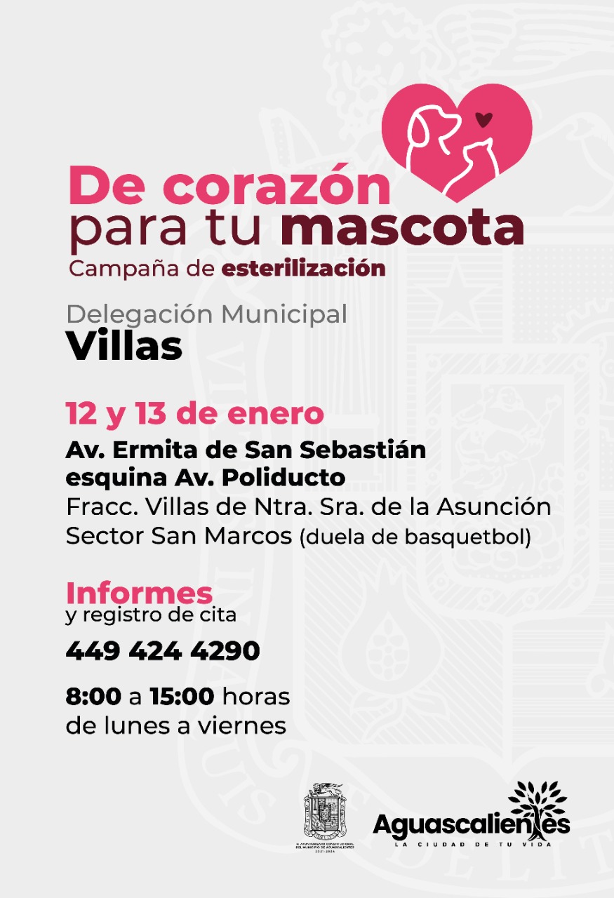 El Municipio de Aguascalientes en coordinación con el Instituto de Servicios de Salud del Estado de Aguascalientes, lleva a cabo la campaña de esterilización gratuita para perros y gatos «De Corazón para tu Mascota», acciones para promover la tenencia responsable de animales de compañía, la salud y el bienestar.