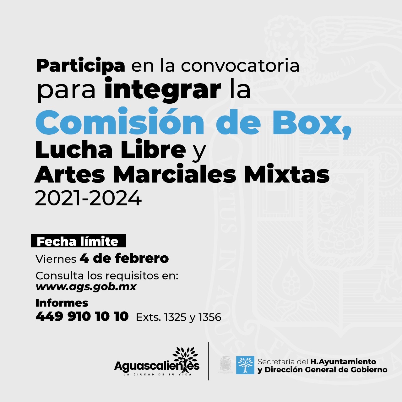 El H. Ayuntamiento de Aguascalientes a través de las Comisiones de Espectáculos, Mercados, Rastros y Estacionamientos y de Educación, Juventud y Deporte, abre la Convocatoria para la integración de la Comisión de Box, Lucha Libre y Artes Marciales Mixtas del Municipio de Aguascalientes 2021-2024.