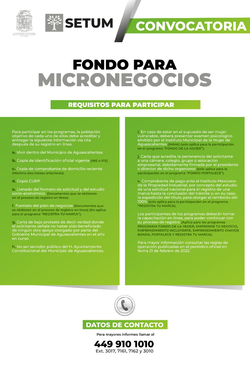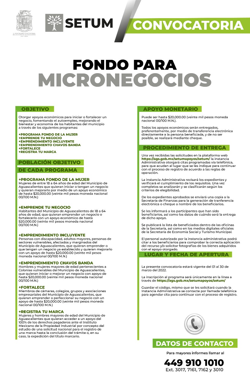 El Municipio de Aguascalientes abre la convocatoria para acceder al Fondo para Micronegocios con el objetivo de impulsar a los emprendedores y negocios locales, a través del cual, se podrán acceder a apoyos para generar su negocio o impulsar el que ya tienen.
