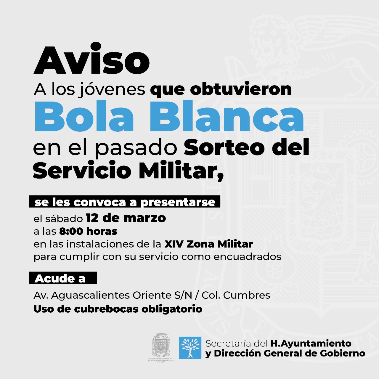 La 14/a Zona Militar a través de la Junta Municipal de Reclutamiento convoca a los jóvenes que como resultado del pasado Sorteo del Servicio Militar Nacional encuartelaron su cartilla con Bola Blanca, a presentarse este sábado 12 de marzo a las 08:00 horas para cumplir con su servicio militar como encuadrados.