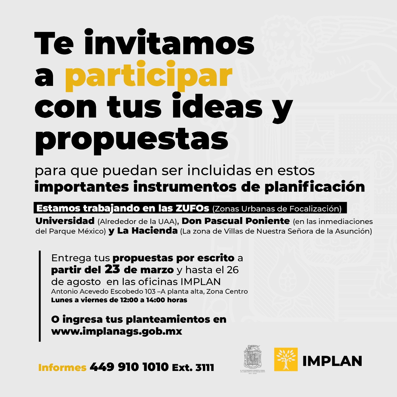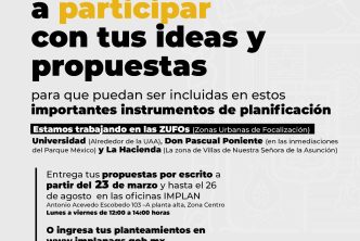 La Presidencia Municipal a través del Instituto Municipal de Planeación y Evaluación de Aguascalientes (IMPLAN) convoca a las personas interesadas en participar en el proceso de elaboración de los instrumentos de planeación denominados Zonas Urbanas de Focalización (ZUFO) de Universidad, La Hacienda y Don Pascual Poniente, por medio de talleres, mesas de trabajo, así como encuestas, promoviendo la participación social en el desarrollo ordenado de la ciudad.