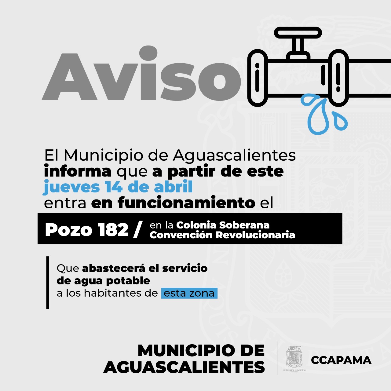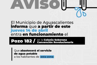 El Municipio de Aguascalientes a través de la Comisión Ciudadana de Agua Potable y Alcantarillado (CCAPAMA) informa que a partir del jueves 14 de abril entra en funcionamiento el Pozo 182 Soberana Convención.