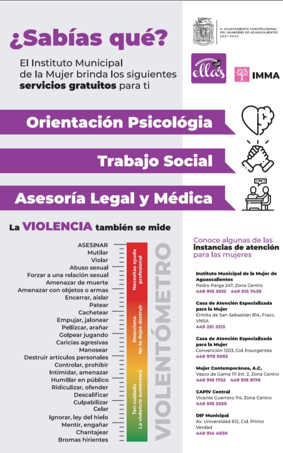 De igual manera con el «Violentómetro» se les ayudará a identificar si son víctimas de violencia y a qué grado, y con «¿Sabías qué?», conocerán los servicios que se proporcionan en el IMMA en materia de asesoría médica, psicológica o legal y también sobre las instancias a las que pueden recurrir y pedir ayuda en caso de sentir que están en peligro.