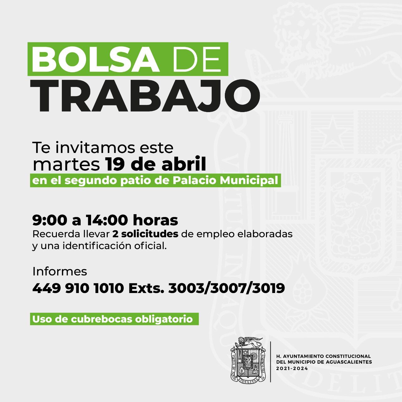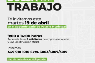 A través de la Secretaría de Economía Social y Turismo Municipal (SETUM) y en coordinación con el sector empresarial, el Ayuntamiento de Aguascalientes, continúa ofreciendo alternativas de empleo a la ciudadanía, por lo que este martes 19 de abril se realizará la Bolsa de Trabajo en Palacio Municipal, de 9:00 a 14:00 horas.