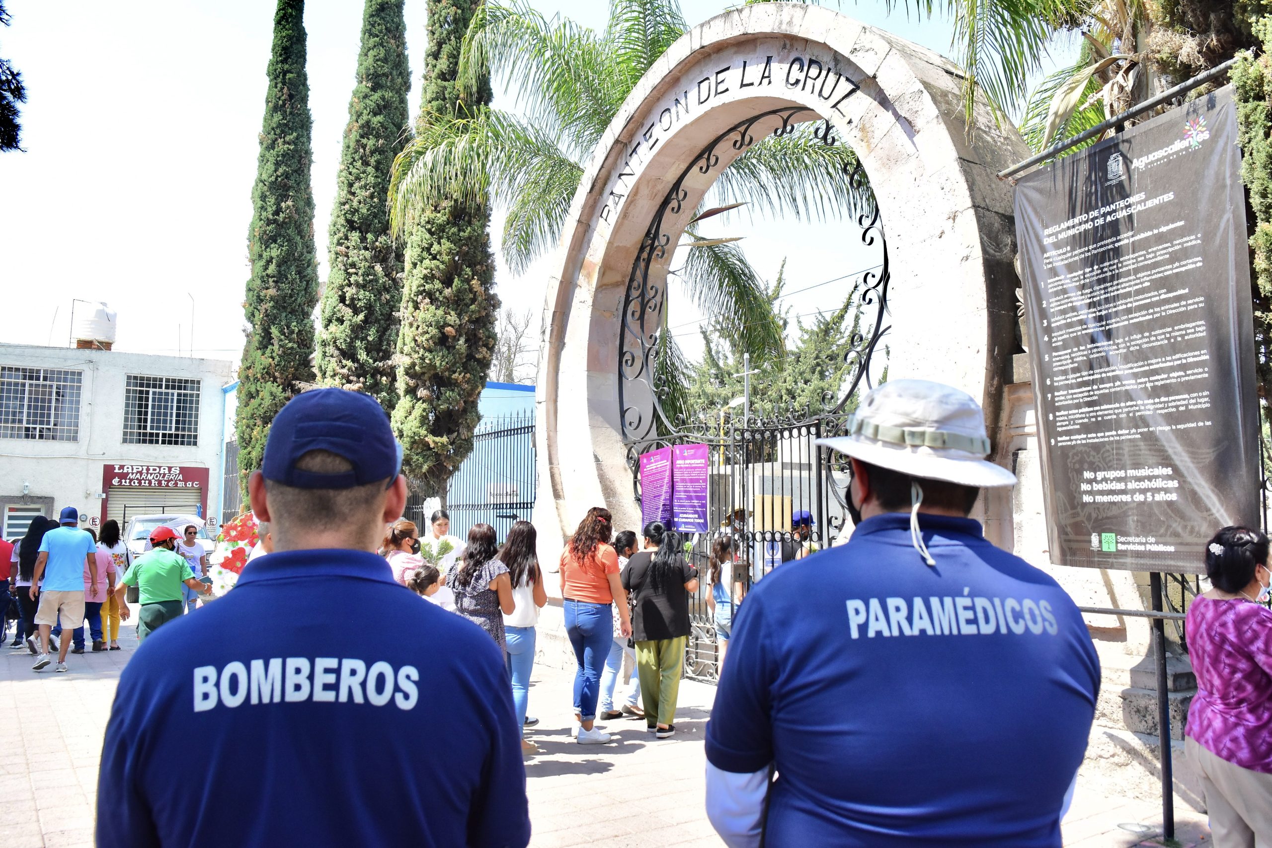 En cada uno de los recintos se llevan a cabo recorridos de vigilancia en el interior y exterior por parte de elementos de la Policía Municipal de Aguascalientes para brindar un entorno seguro, de igual manera al exterior de los panteones se encuentran elementos de la Policía Vial para auxiliar a los visitantes para que puedan cruzar con total seguridad las Avenidas que confluyen a dichos sitios.