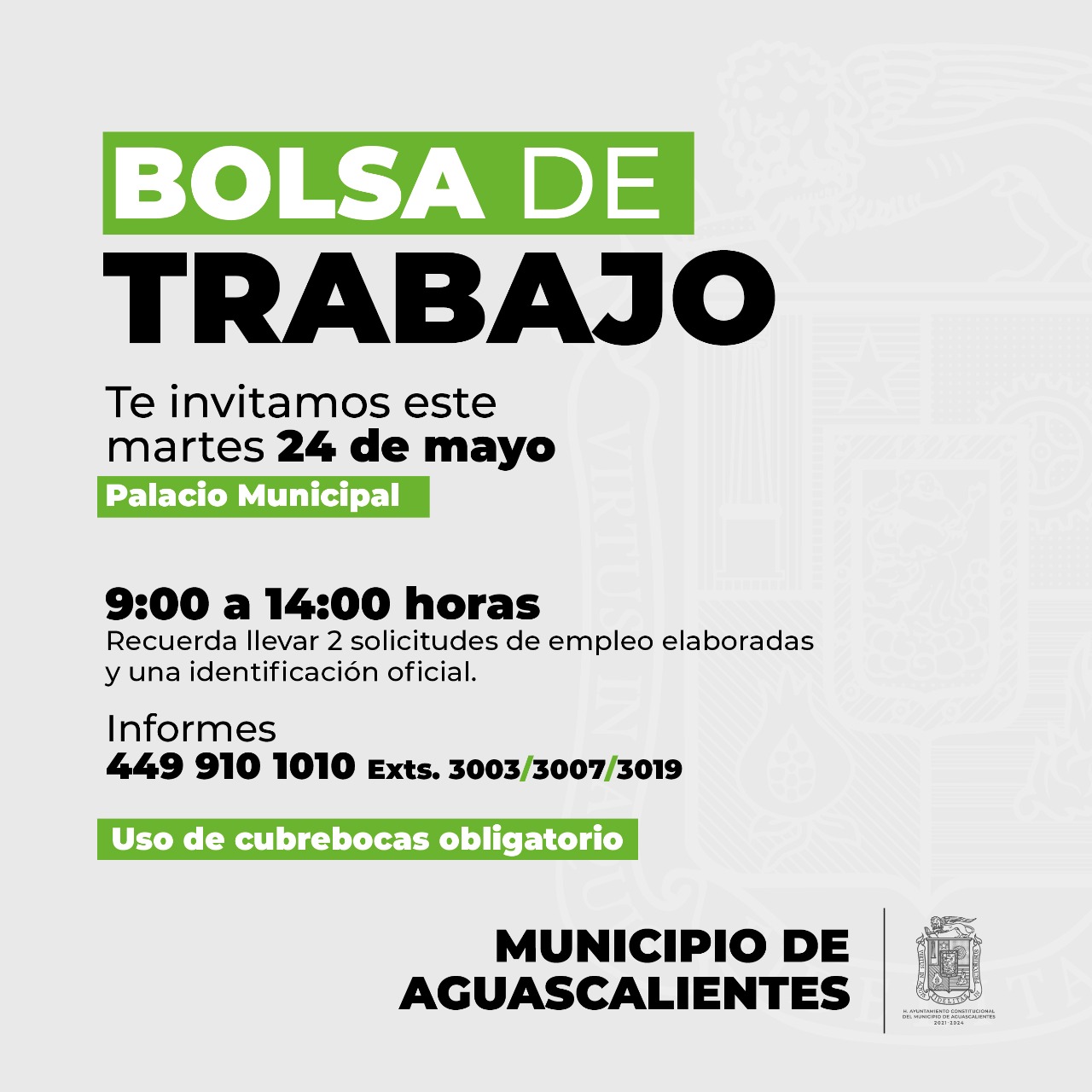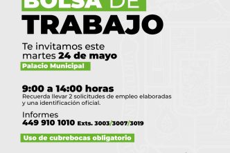 Con el objetivo de ofrecer más empleos para las personas que así lo requieran, a través de la Secretaría de Economía Social y Turismo Municipal (SETUM), se realizará este martes 24 de mayo la Bolsa de trabajo en Palacio Municipal, de 9:00 a 14:00 horas.
