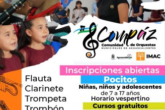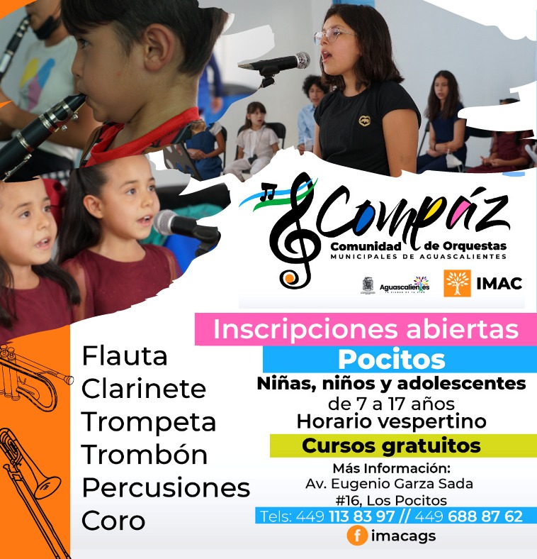 El Instituto Municipal de Aguascalentense para la Cultura (IMAC) invita a los niños, niñas y adolescentes de 7 a 17 años de edad a formar parte de la Comunidad de Orquestas Municipales de Aguascalientes (COMPÁZ) Pocitos, en donde se fomenta la inclusión, el desarrollo social y el derecho a la cultura, mediante la enseñanza de la música.