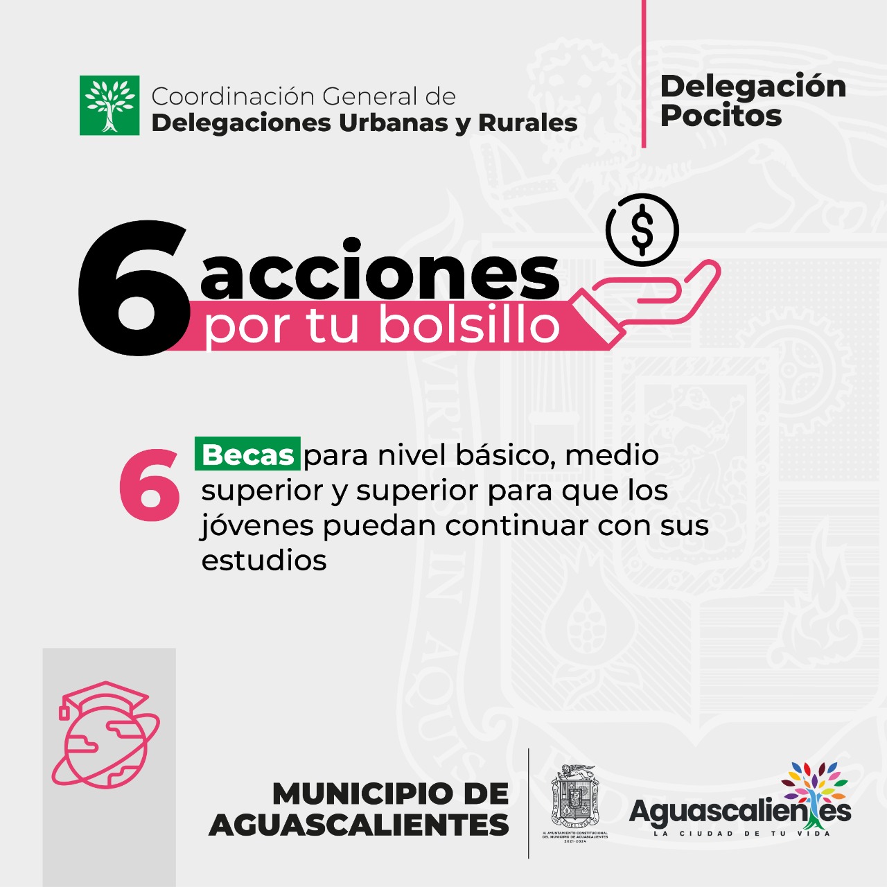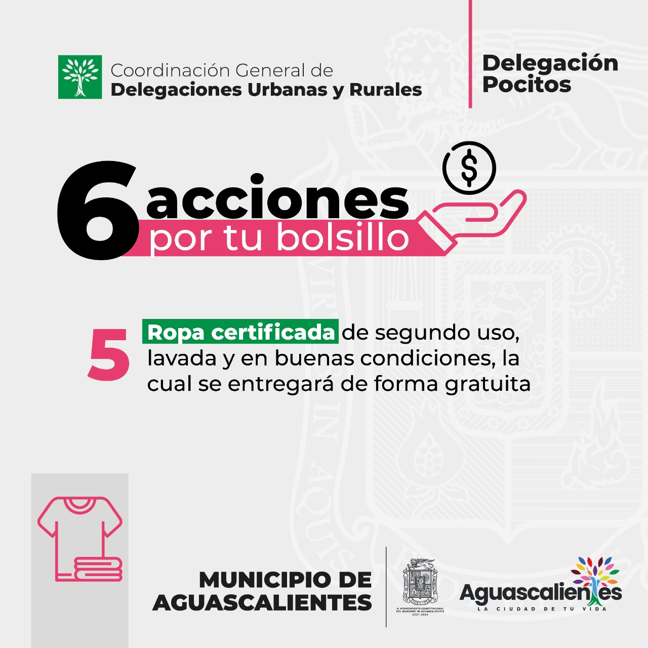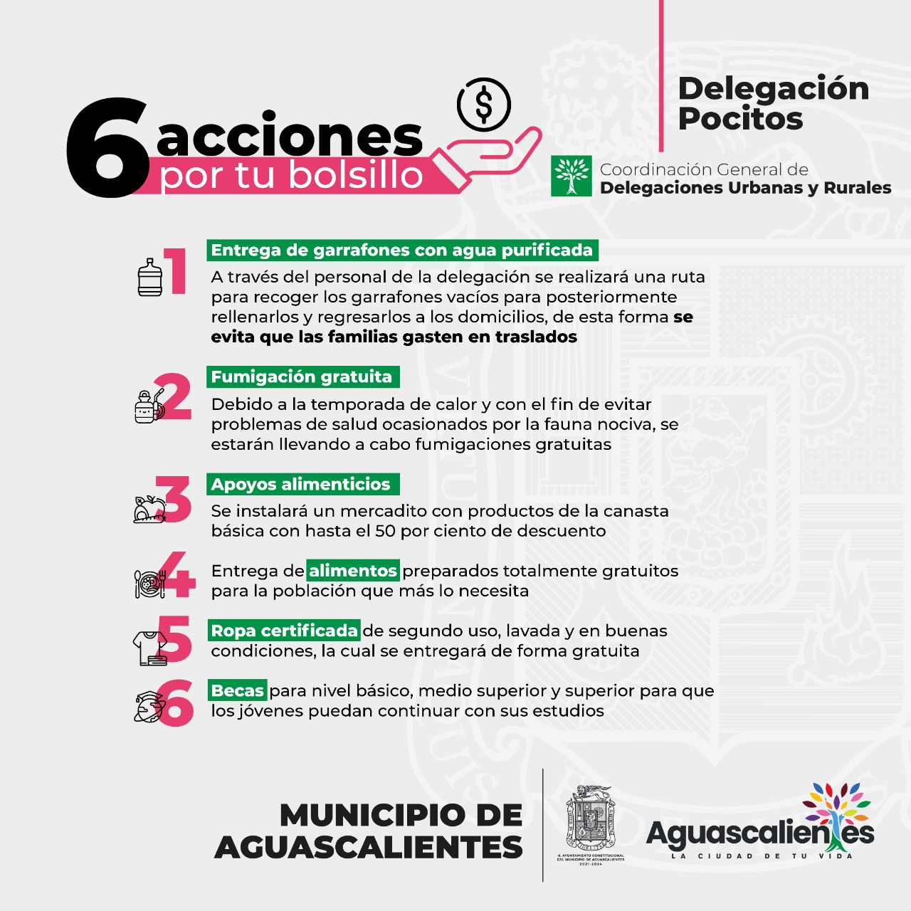 La presidencia municipal de Aguascalientes, a través de la Delegación Pocitos pone en marcha la campaña denominada “6 acciones por tu bolsillo” con el propósito de beneficiar la economía familiar de los sectores más vulnerables que residen en el poniente de la ciudad capital.
