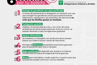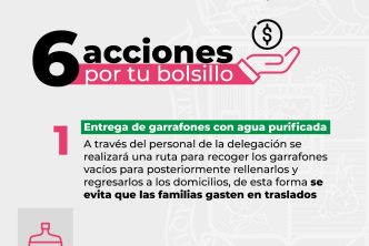 1. Entrega de garrafones con agua purificada: a través del personal de la Delegación se realizará una ruta para recoger los garrafones vacíos para posteriormente rellenarlos y regresarlos a los domicilios, de esta forma se evita que las familias gasten en traslados