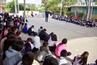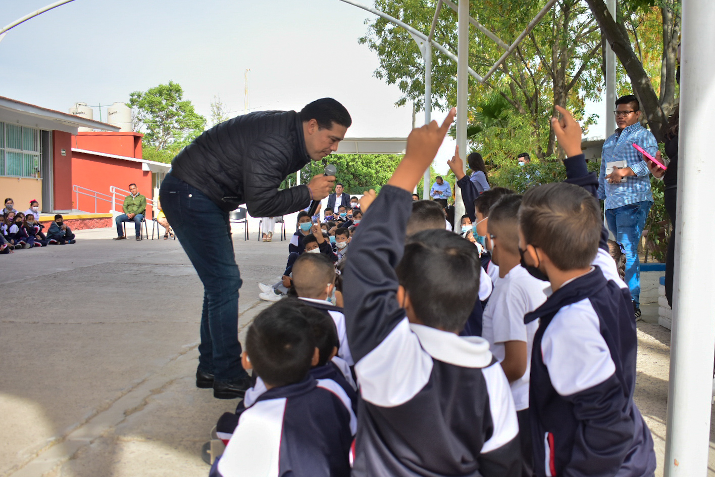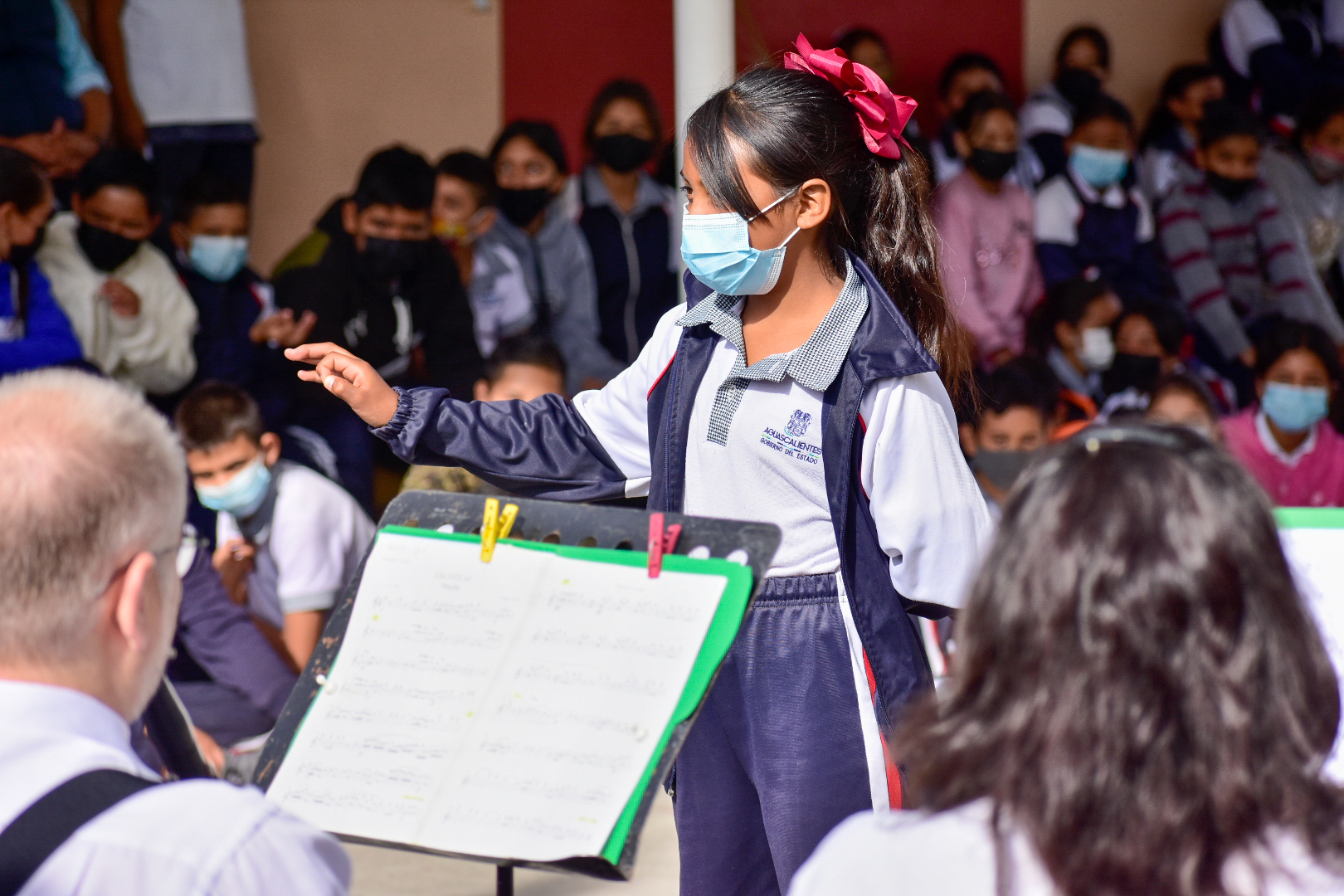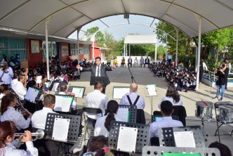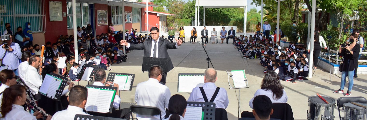 Lizbeth Araceli Jáuregui, directora de la escuela primaria agradeció la oportunidad de otorgarles a los niños y niñas del plantel una experiencia musical de este tipo, en la cual los pequeños tuvieron un acercamiento con la música al interactuar con los integrantes de la banda, en esta ocasión, bajo la dirección del maestro Francisco Javier Esqueda quien también agradeció la invitación y brindó una pequeña clase sobre los instrumentos que conforman a la Banda Sinfónica como el flautín, la flauta, clarinete, saxofón, tubas, trompetas, entre otras, ambientando a toda la institución y dándole la oportunidad a los pequeños para que pudieran tocar algunos de los instrumentos y a su vez dirigir a la Banda.