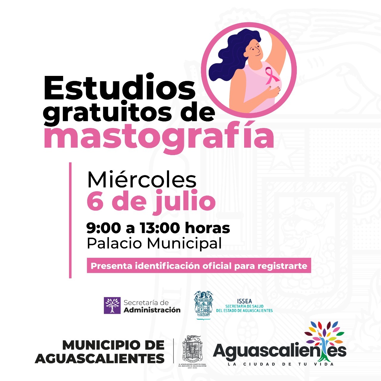 Este miércoles 6 de julio el Municipio de Aguascalientes lanzará en Palacio Municipal la campaña de salud y fomento a la detección oportuna de cáncer de mama “Cuídate”, en donde se otorgarán pases para estudios gratuitos de mastografía.