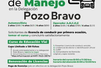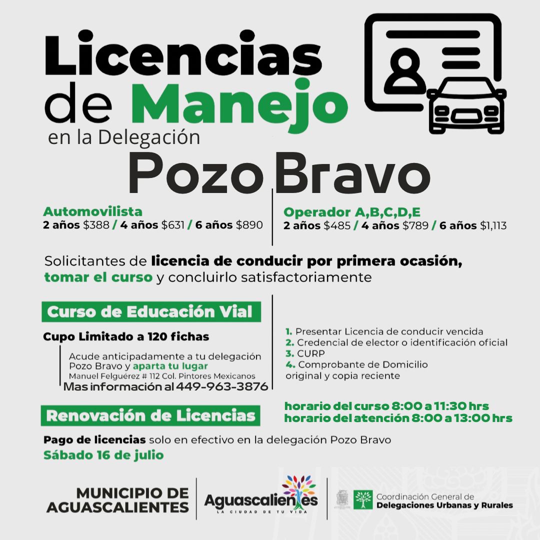 La atención para renovación de licencia será este sábado 16 de julio de 8:00 a 13:00 horas en la Delegación Pozo Bravo ubicada en Manuel Felguérez #112 Colonia Pintores Mexicanos; se contará con un cupo limitado de 120 fichas, mismas que comenzarán a entregarse a partir de esta publicación.