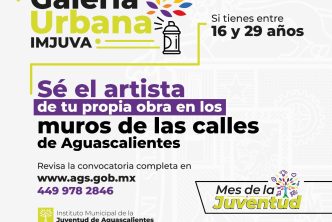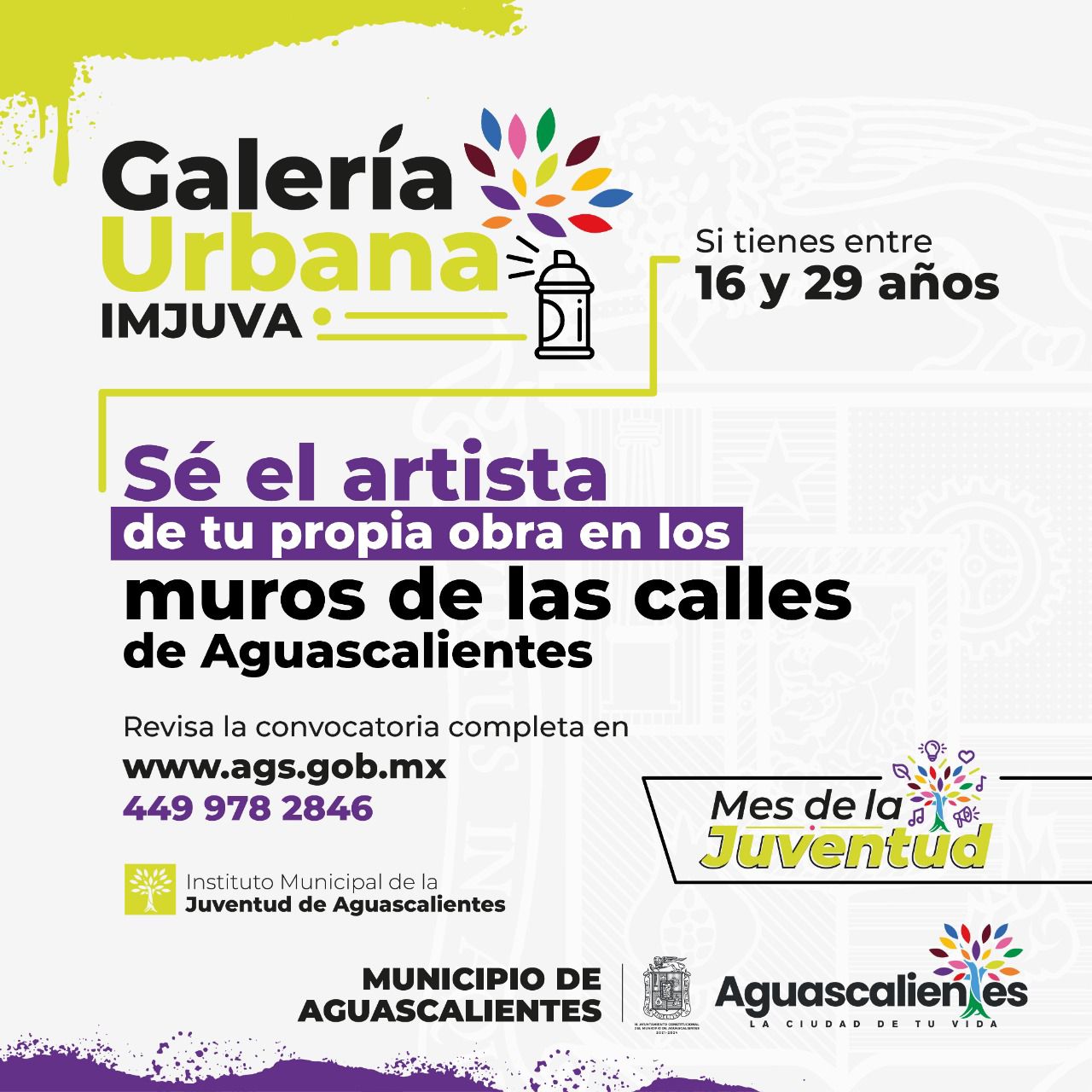 Dentro del marco del mes de la juventud, la Presidencia Municipal a través del Instituto Municipal de la Juventud de Aguascalientes (IMJUVA), lanza la convocatoria para que personas de 16 a 29 años de edad participen en el concurso “Galería Urbana IMJUVA”, programa de intervención social que busca brindar espacios de expresión y herramientas a los jóvenes, para dar a conocer su obra.