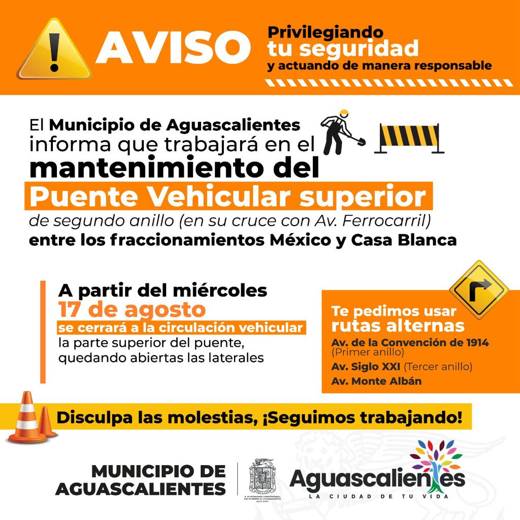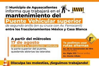 Con el objetivo de evitar riesgos a la ciudadanía, la Secretaría de Obras Públicas del Municipio de Aguascalientes (SOPMA) llevará a cabo trabajos de mantenimiento del puente vehicular superior de segundo anillo (en su cruce con Av. Ferrocarril) entre los fraccionamientos México y Casa Blanca.