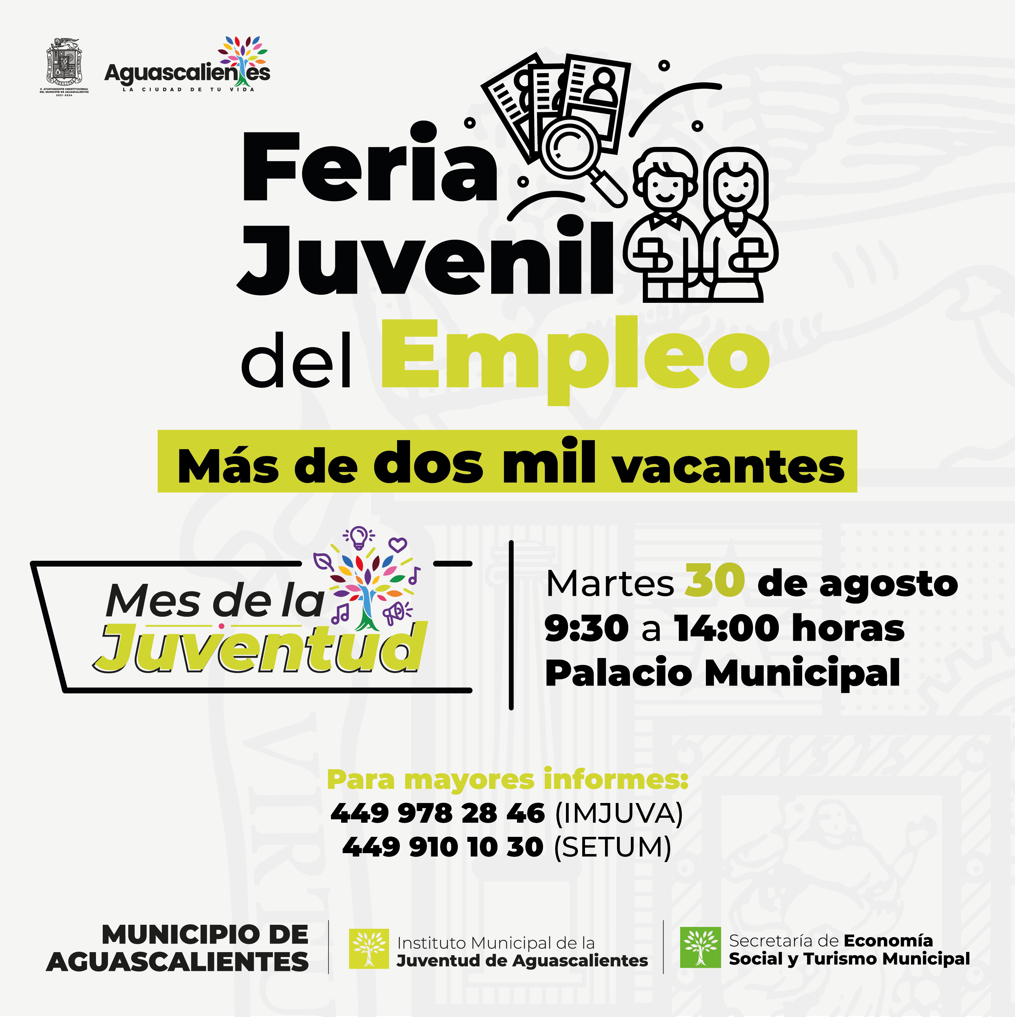 El Municipio de Aguascalientes a través de la Secretaría de Economía Social y Turismo Municipal (SETUM), en coordinación con el Instituto Municipal de la Juventud del Municipio de Aguascalientes (IMJUVA), realizará la “Feria del Empleo Juvenil”, con el objetivo de brindar más y mejores oportunidades al sector joven de la población.