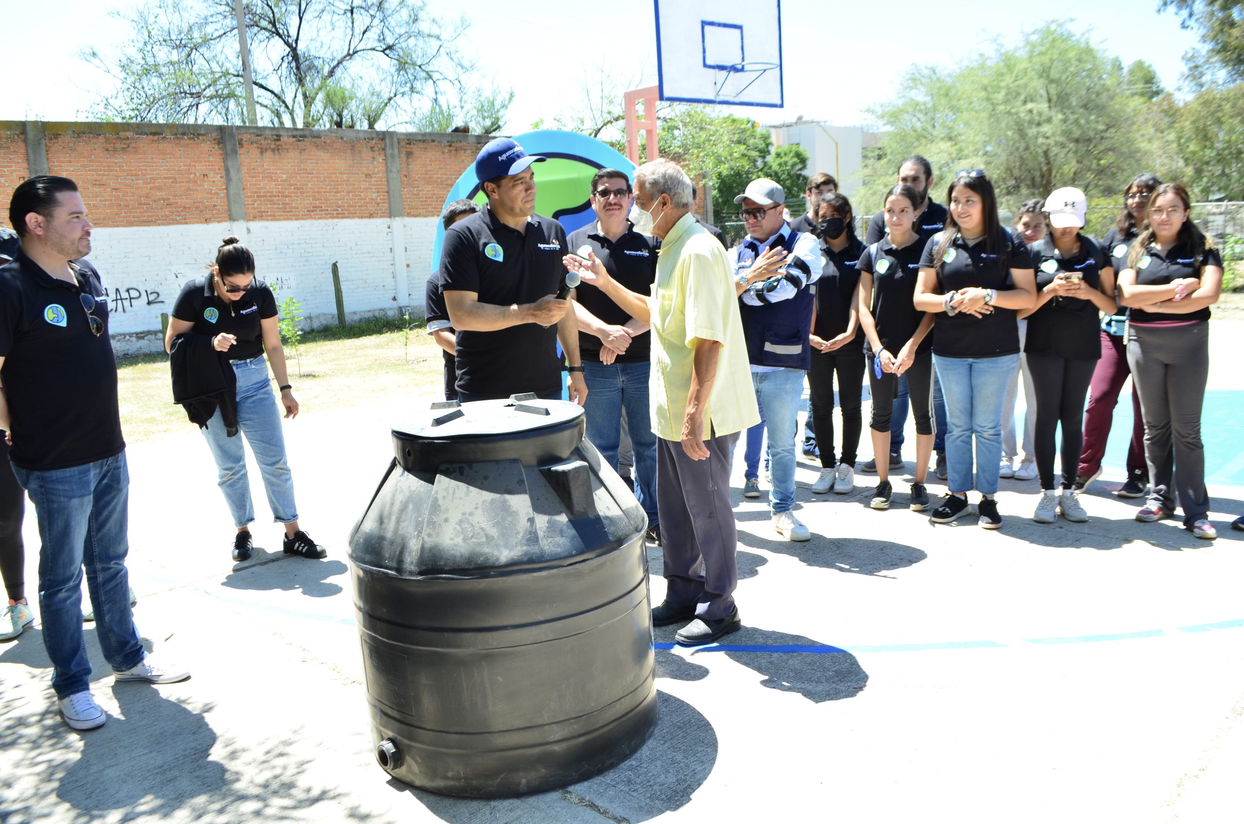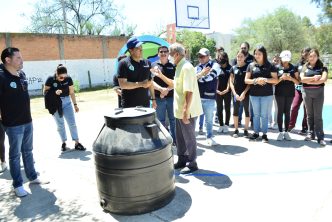 El regidor Luis Armando Salazar Mora; Arturo González Estrada, titular de la Oficina Ejecutiva del Presidente Municipal; Aquiles Alafita Sáenz, director de Cooperación, Financiamiento y Asuntos Internacionales, y Leonardo Montañez entregaron un tinaco en donación para la Asociación Civil, así como las constancias que acreditan la labor social realizada por estos jóvenes en diferentes países como Turquía, Suiza y Alemania, entre otros.