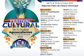 Conciertos, música, danza, teatro y presentaciones editoriales, entre otros, son parte de los más de 80 eventos que de manera gratuita se presentarán como parte del Festival Cultural con motivo del 447 Aniversario de la Fundación de la Ciudad de Aguascalientes, que se llevarán a cabo del 14 al 23 de octubre.