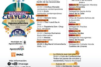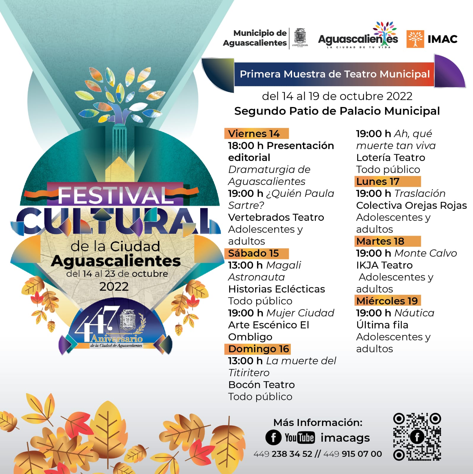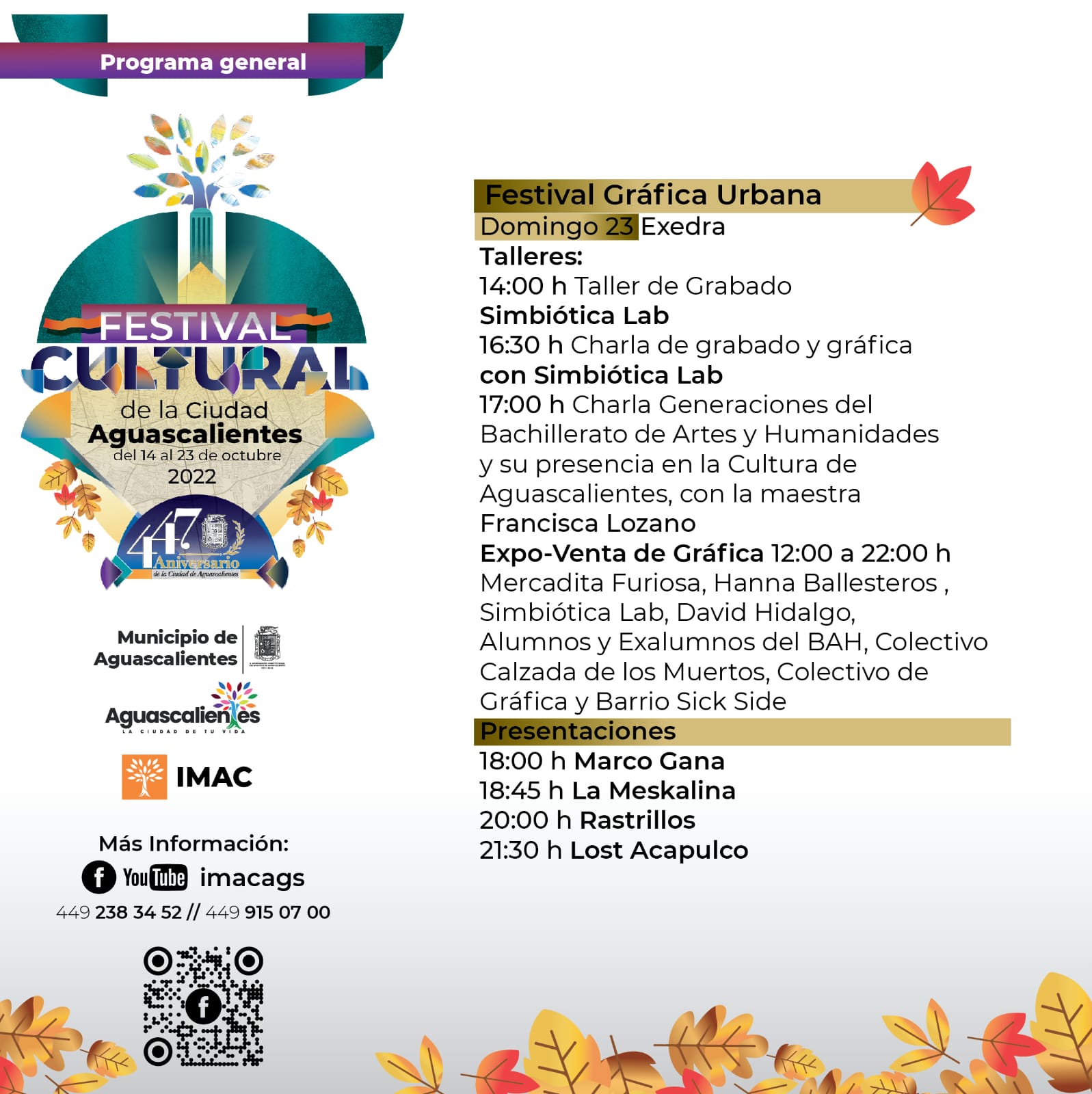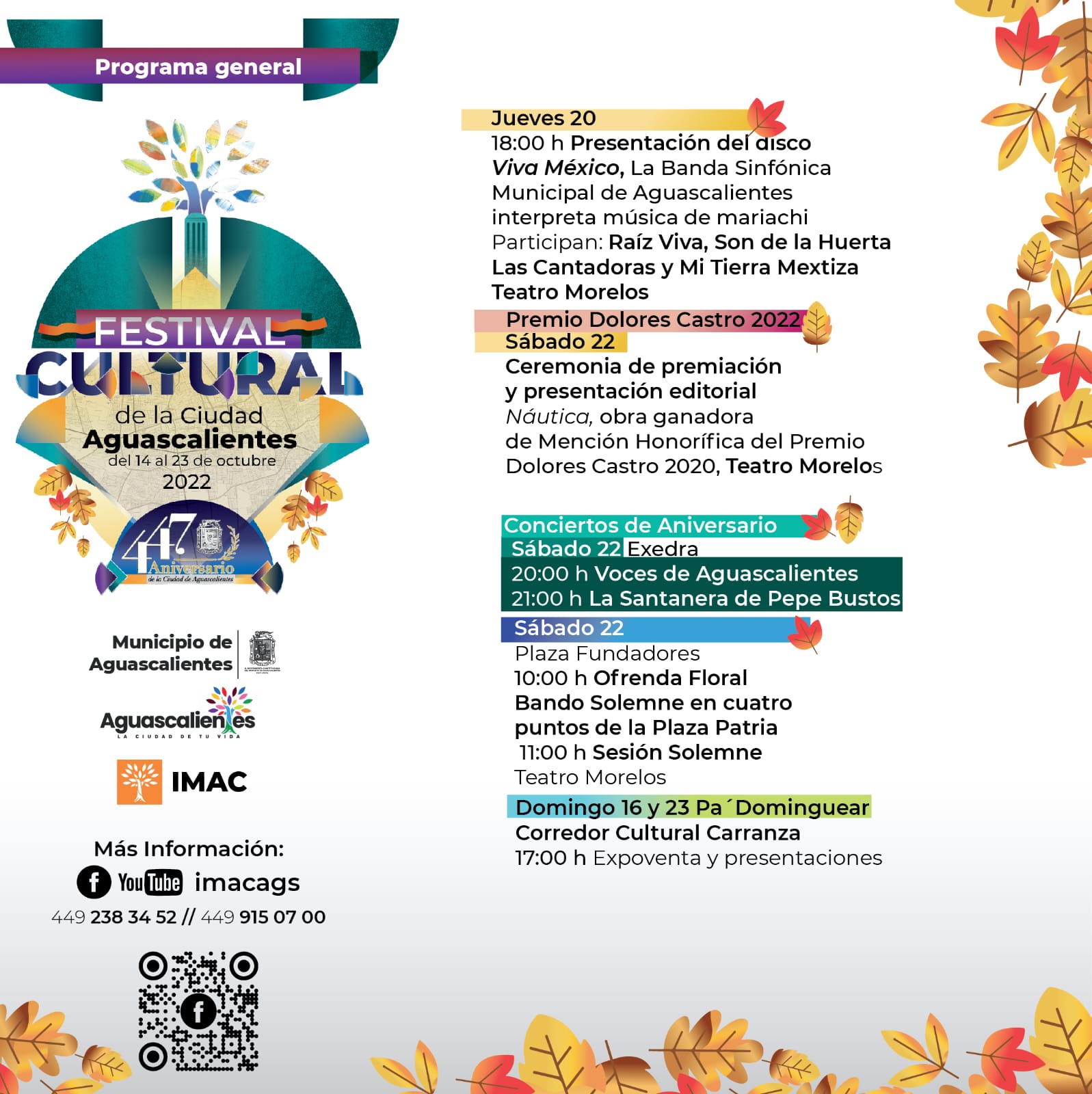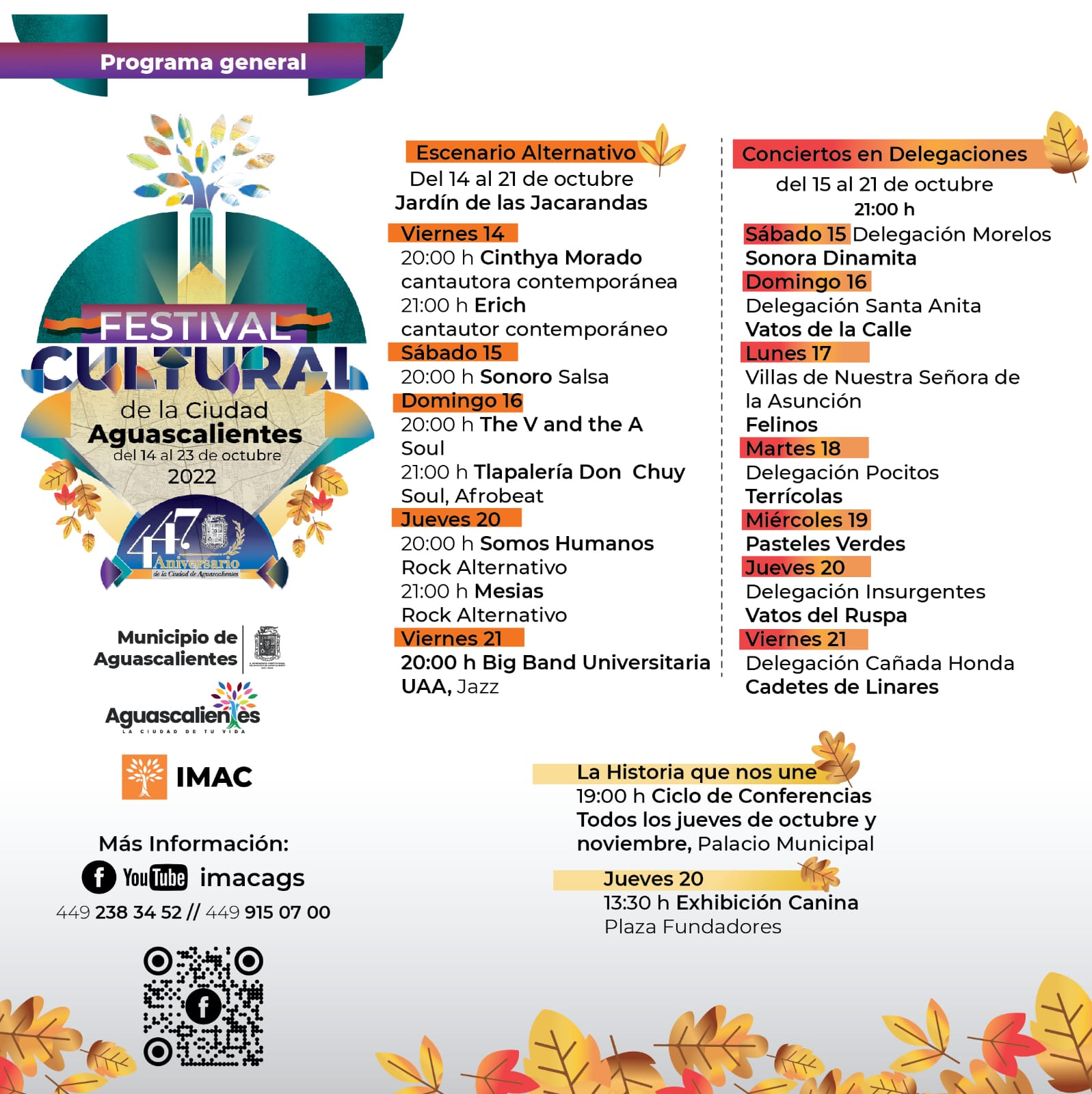 El programa completo para el Festival Cultural de la Ciudad se puede consultar en el portal web www.ags.gob.mx, en redes sociales del IMAC y del  Municipio de Aguascalientes.
