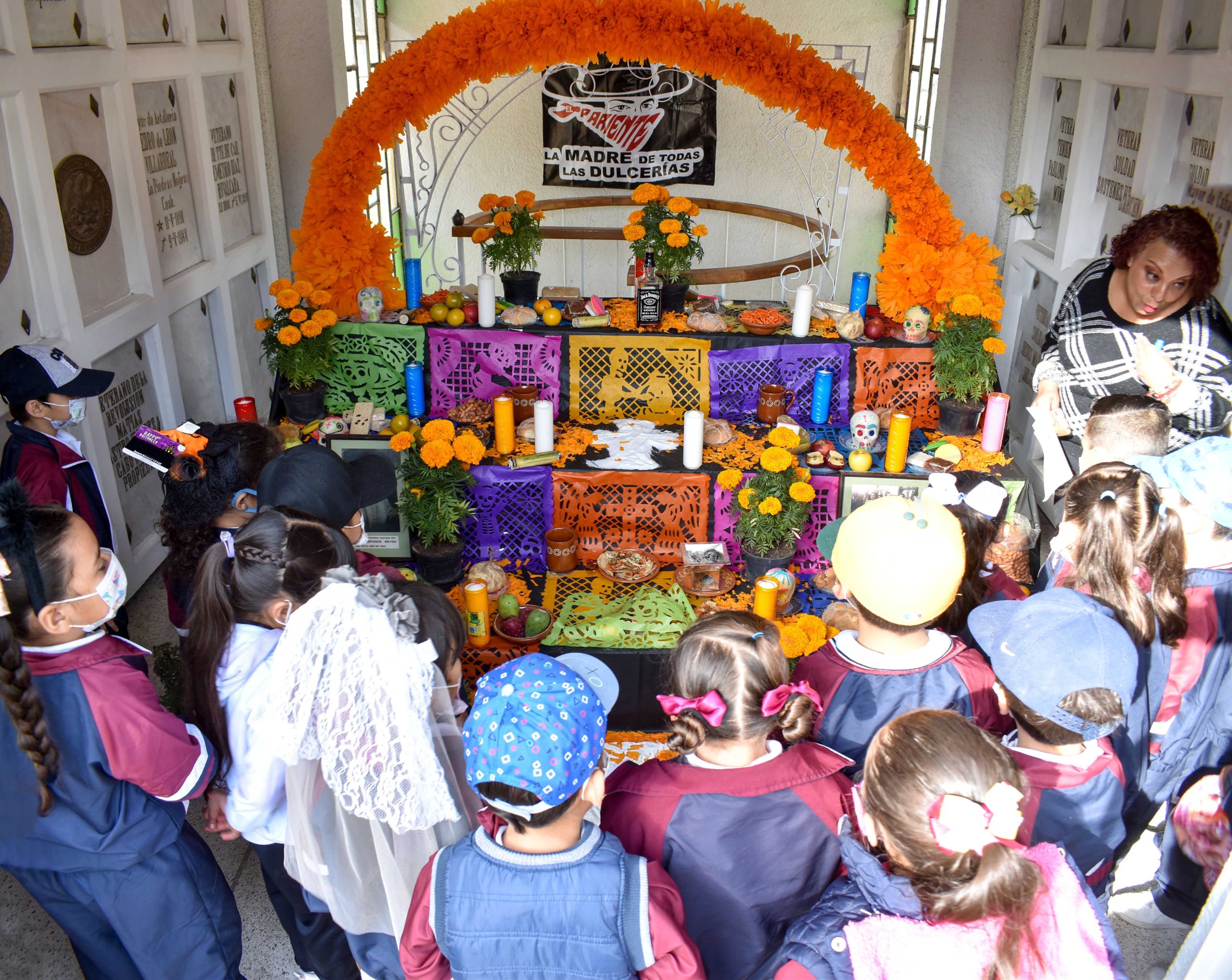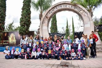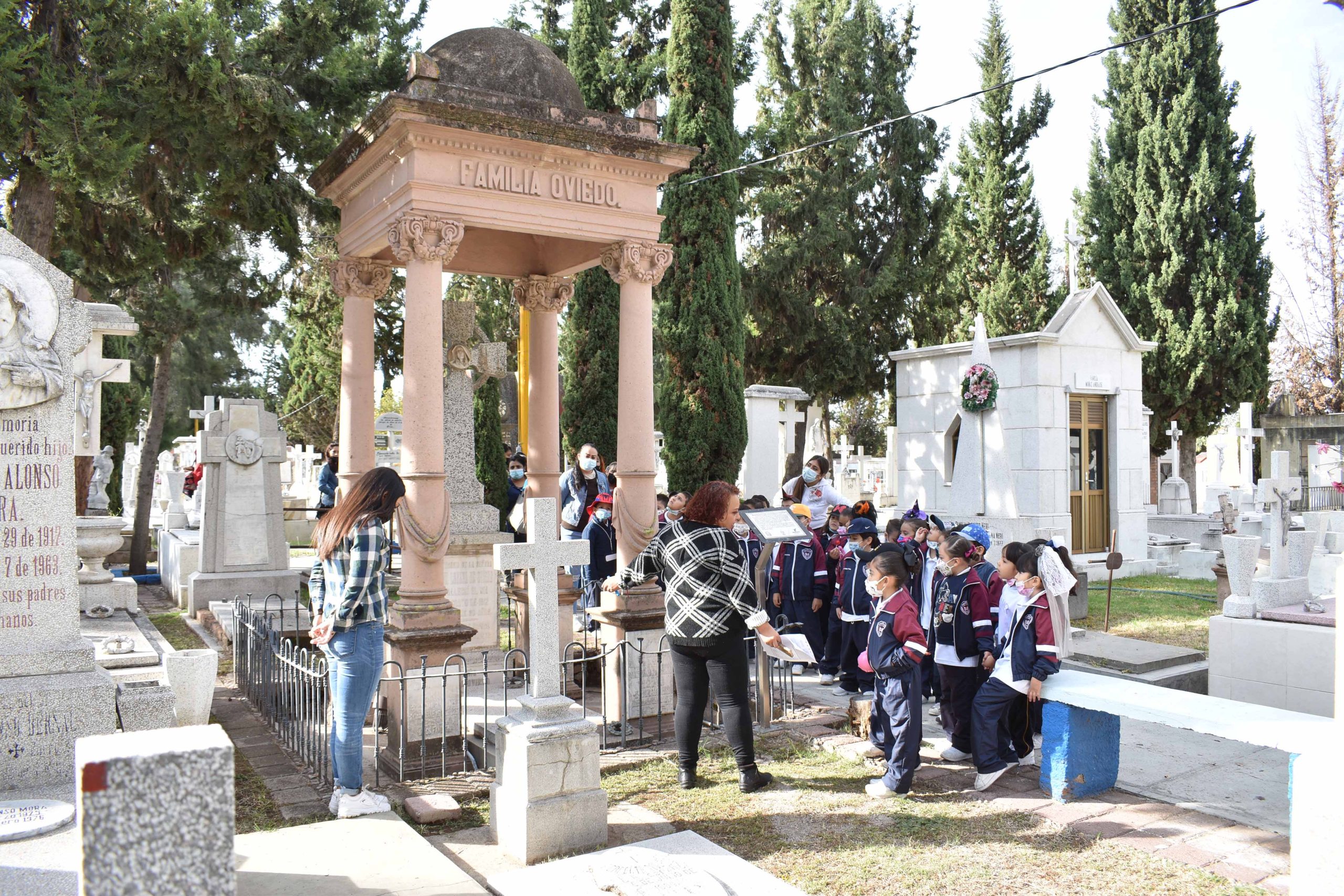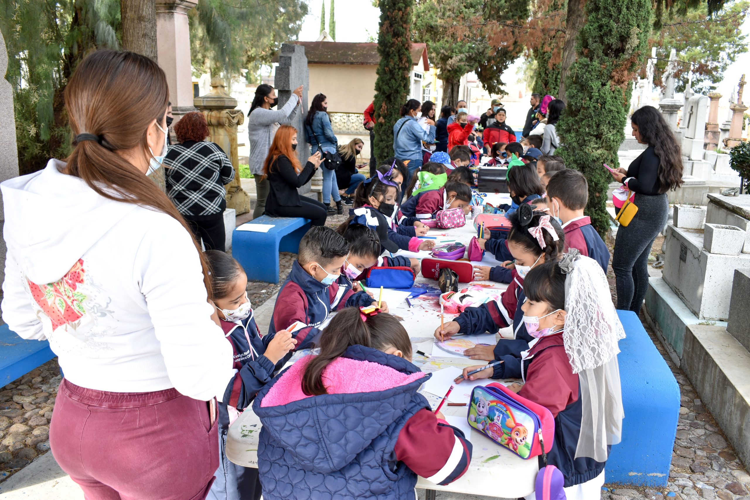 Niños de preescolar y primaria salen de sus salones de clases para visitar los panteones municipales La Cruz y Los Ángeles, en donde con actividades recreativas conocen más de la cultura mexicana del Día de Muertos y pasan momentos de sana convivencia y aprendizaje.