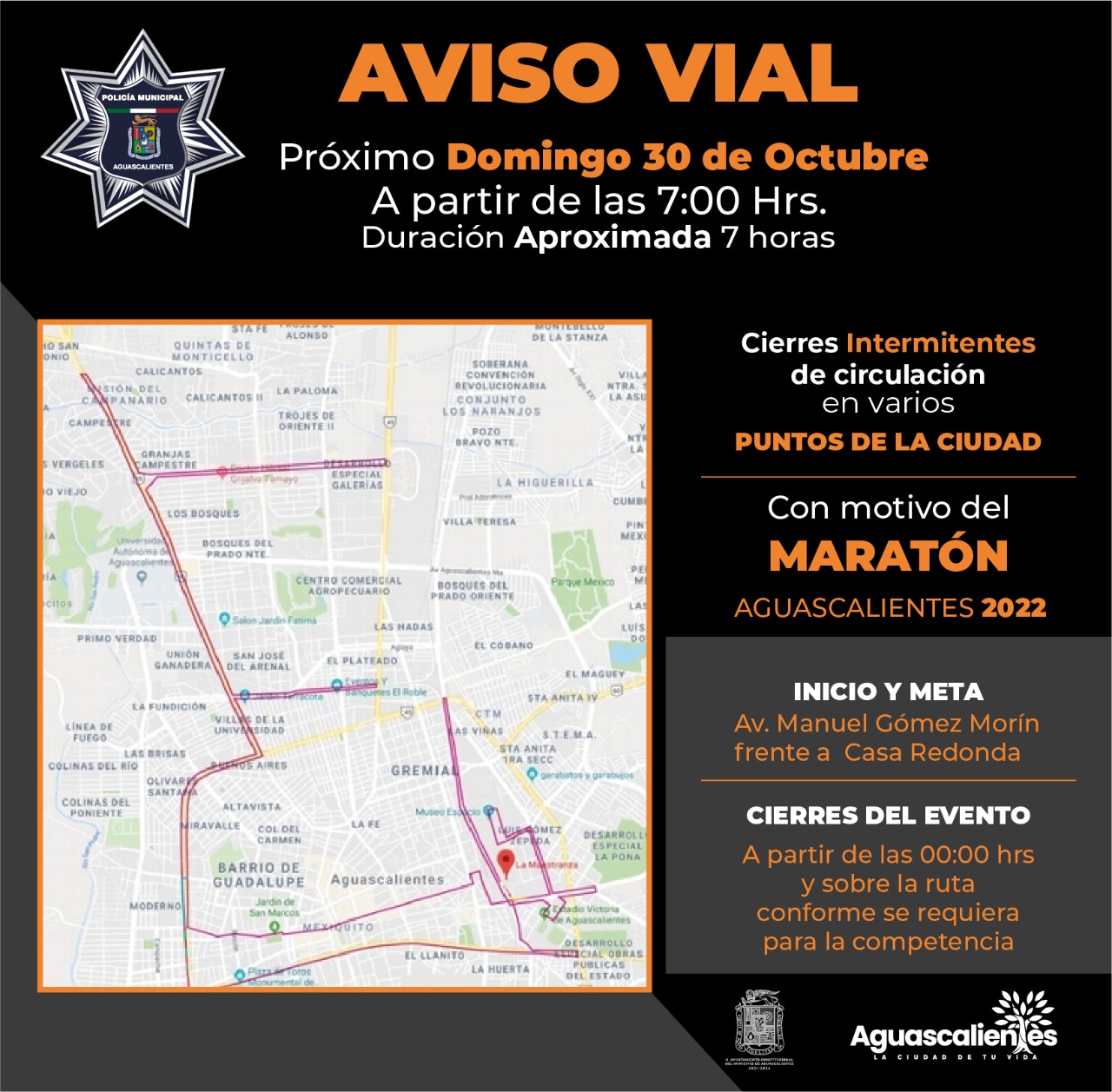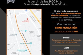 La Secretaría de Seguridad Pública del Municipio de Aguascalientes informa que implementará un operativo vial con motivo del “Maratón Aguascalientes 2022”, mismo que iniciará por la noche del viernes 28 de octubre, por lo que se recomienda a la ciudadanía tomar las debidas precauciones para evitar contratiempos.