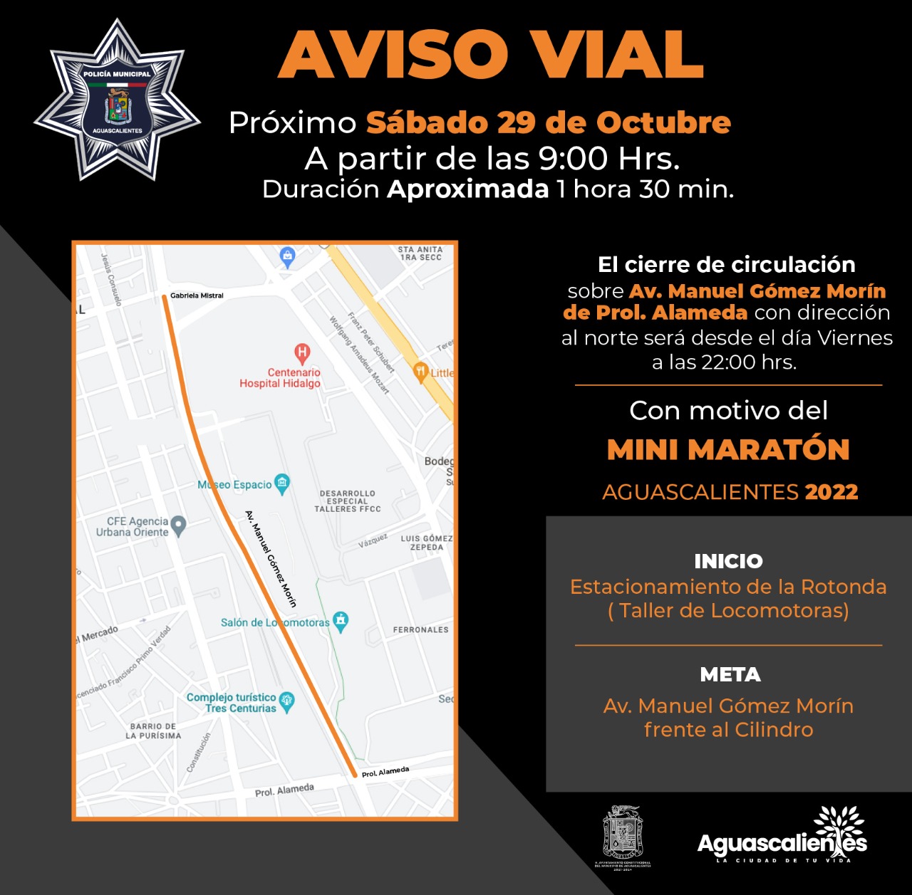 - Habrá cierres viales desde las 22:00 horas del viernes 28 de octubre en la Av. Gómez Morín, por el desarrollo del Mini Maratón programado para el sábado