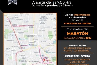 Para el domingo 30 el dispositivo vial del Maratón Aguascalientes 2022 dará inicio a las 00:00 con el cierre de Gómez Morín y la calzada norte de la Av. Alameda. Los cierres totales de las demás calles y avenidas del recorrido comenzarán a las 07:00 horas y se reabrirán ambas vías conforme terminen de pasar los participantes.