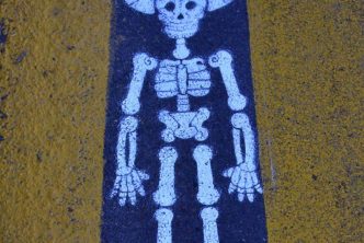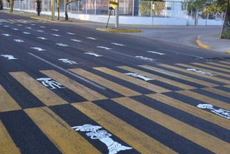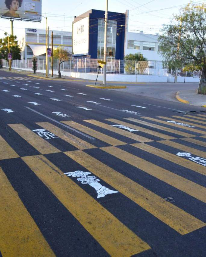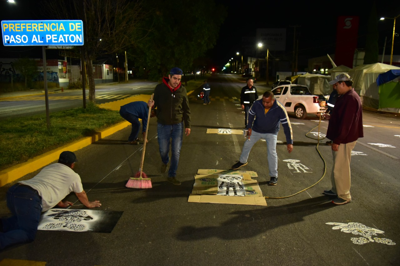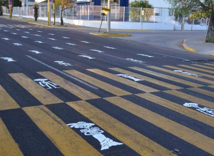 La Presidencia Municipal de Aguascalientes, a través de la Secretaría de Servicios Públicos, rotuló con figuras alusivas al Día de Muertos el cruce peatonal de la Avenida Convención poniente, en su cruce con Arroyo de Los Arellano.