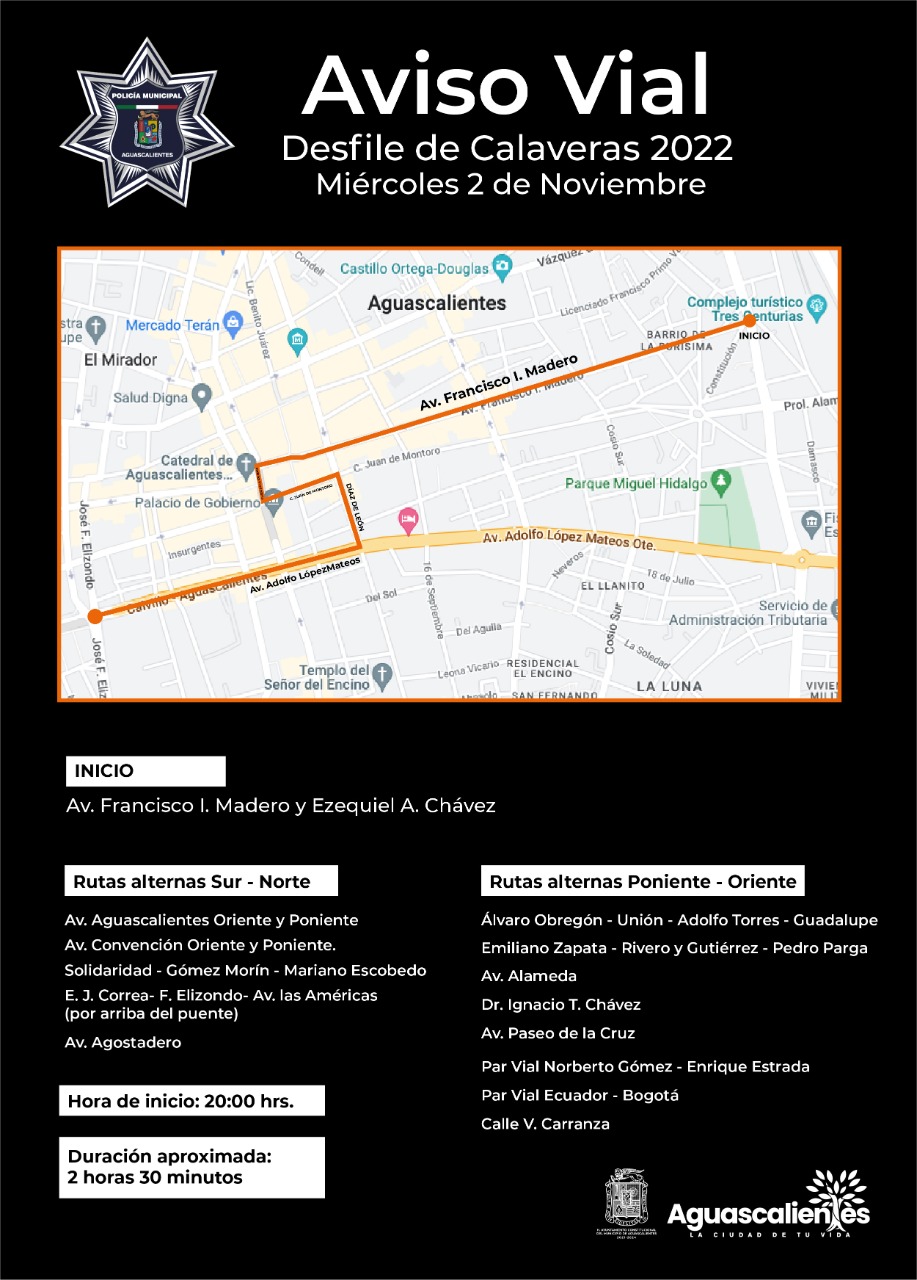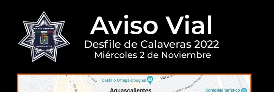 Con motivo del “Desfile de Calaveras 2022” que se desarrollará la noche de este miércoles 2 de noviembre, la Secretaría de Seguridad Pública Municipal de Aguascalientes a través de la Dirección de Movilidad anuncia cierre de vialidades en las principales calles de la Zona Centro de la Ciudad.