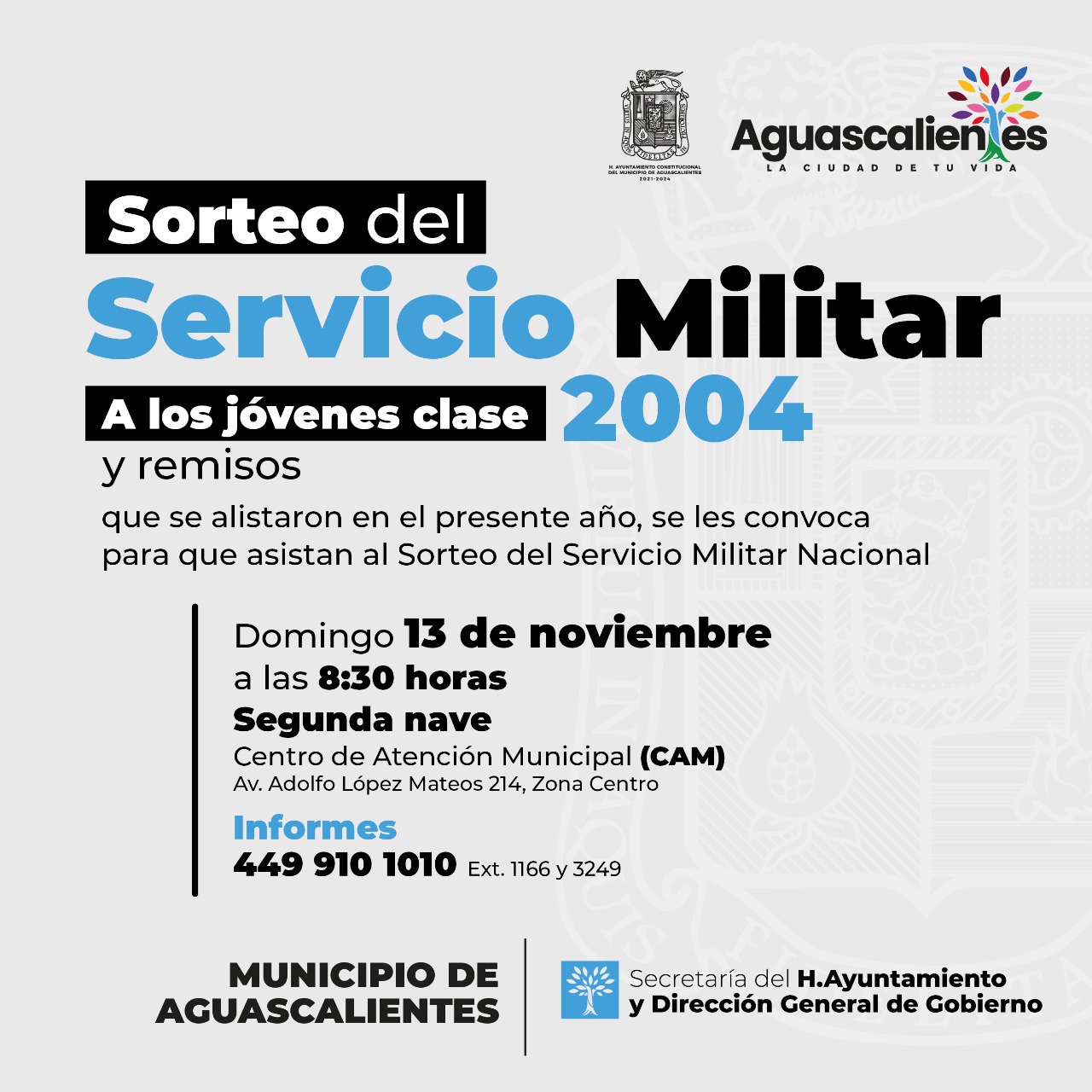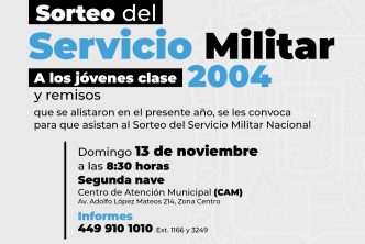 La Junta Municipal de Reclutamiento convoca a los jóvenes clase 2004 y remisos que tramitaron su cartilla y se alistaron en el proceso del presente año, al Sorteo del Servicio Militar Nacional que se llevará a cabo este domingo 13 de noviembre, en la nave 2 del Centro de Atención Municipal (CAM).