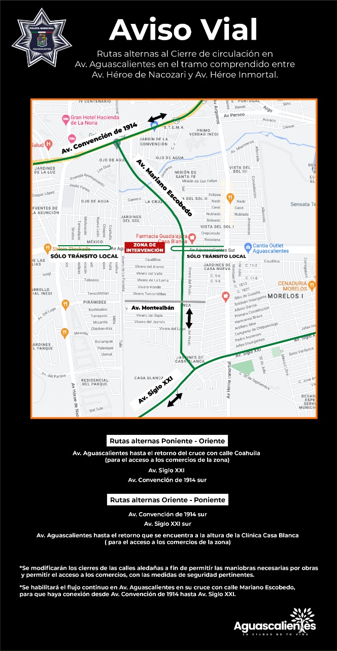 Se sugiere tomar rutas alternas de circulación de oriente a poniente y viceversa, como avenida de la Convención de 1914 y Siglo XXI; además en el lado poniente del cruce ferroviario se abrieron los carriles laterales de avenida Aguascalientes en el tramo comprendido de Héroe de Nacozari hasta la calle Coahuila, en el fraccionamiento México, y del lado oriente los carriles laterales, de avenida General Mariano Escobedo hasta a la altura de la clínica Casa Blanca, para generar una mayor movilidad del tránsito local.