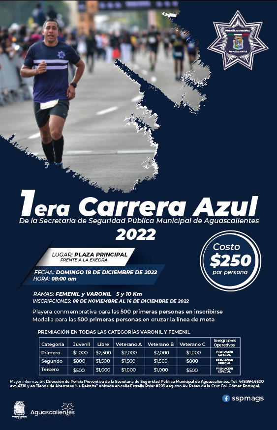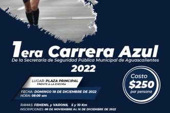 El titular de la Secretaría de Seguridad Pública Municipal de Aguascalientes (SSPM), Antonio Martínez Romo a través de la Coordinación de Cultura y Deporte, extendió una invitación a participar en la “1ª Carrera Azul de la Secretaría de Seguridad Pública Municipal de Aguascalientes 2022”, el domingo 18 de diciembre a las 08:00 horas, en donde podrán competir la ciudadanía y policías activos de las diferentes corporaciones.