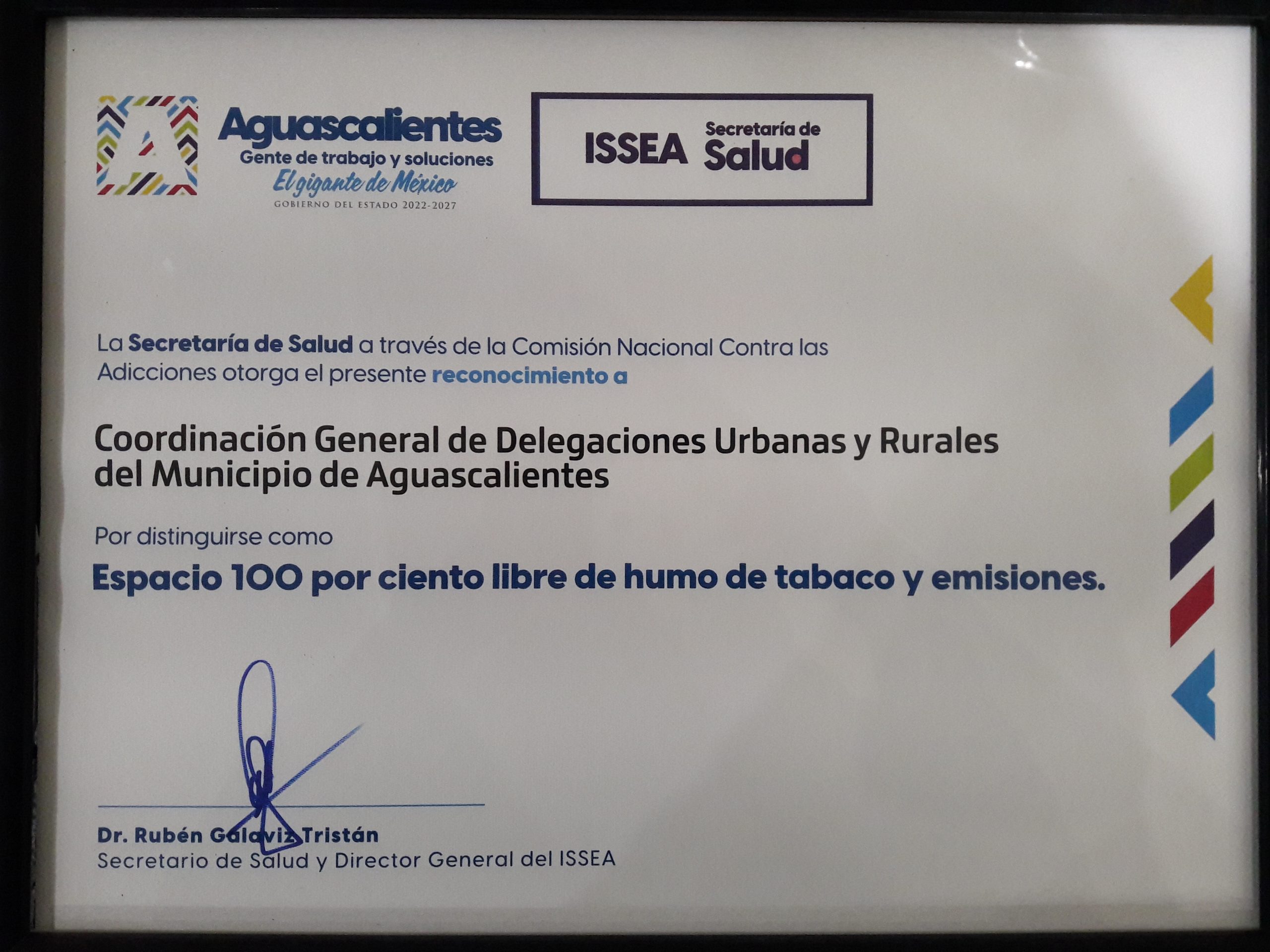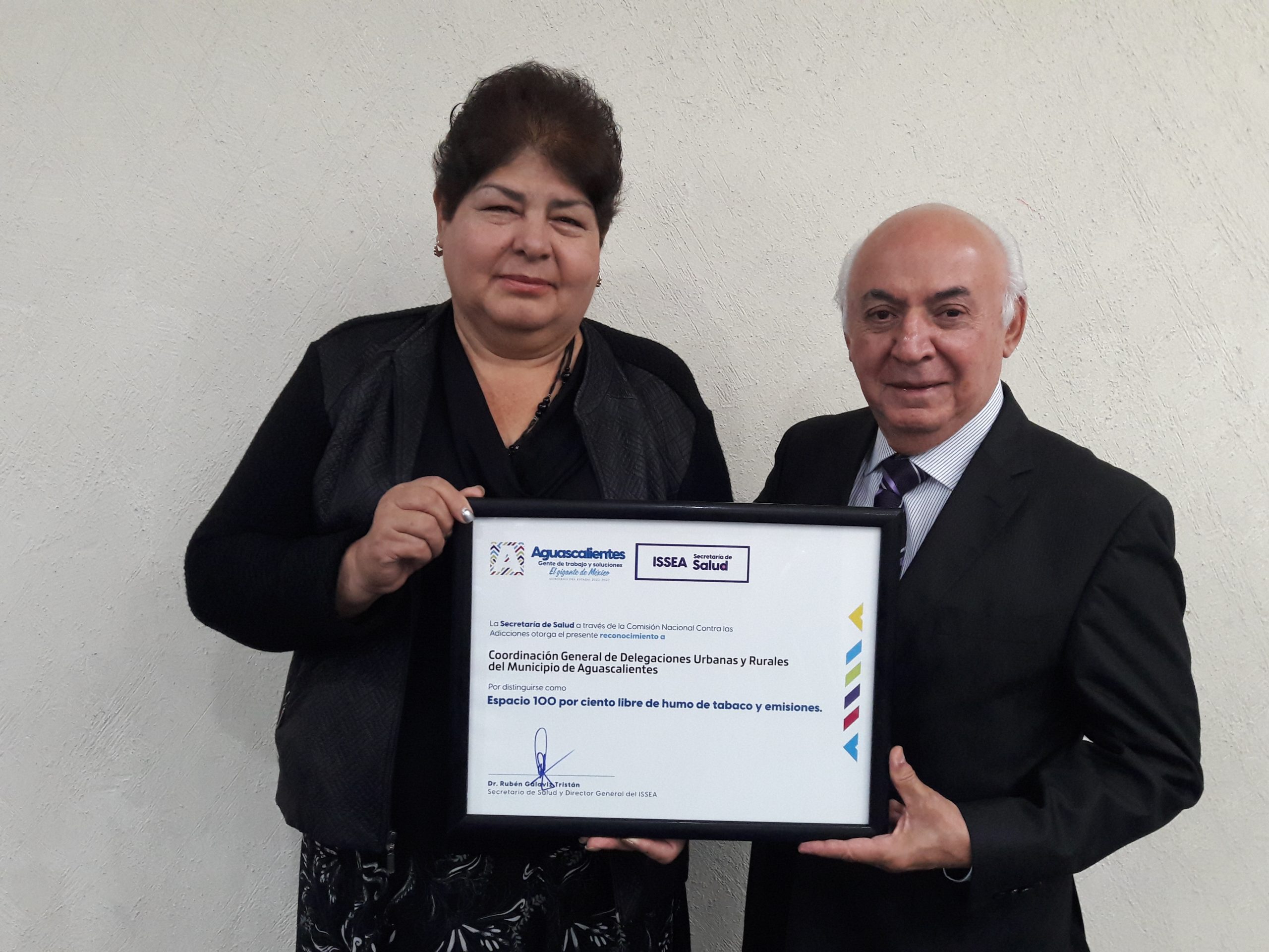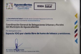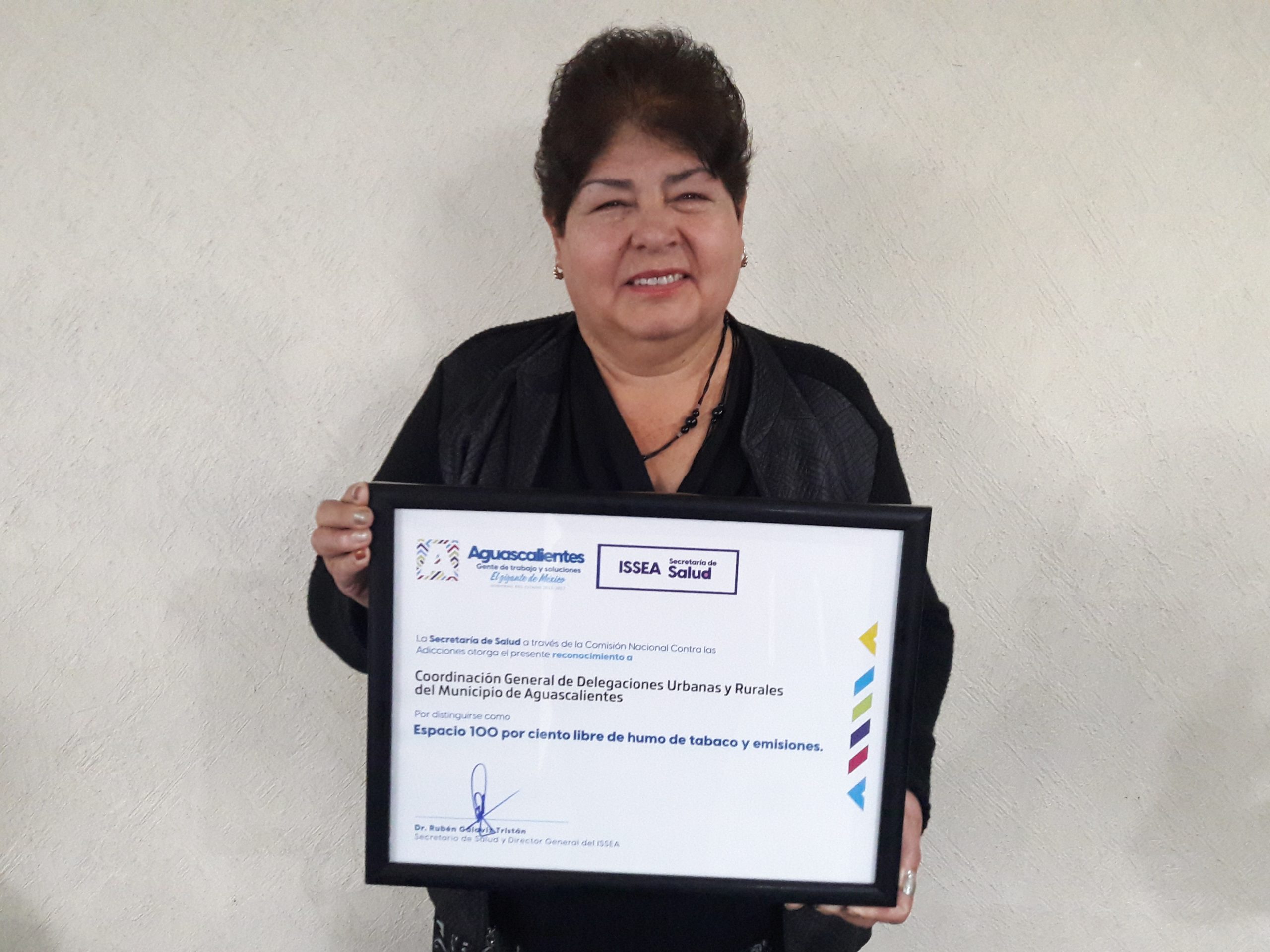 La coordinadora general de Delegaciones, Sanjuana Adriana Estrada González recibió por parte de la Secretaría de Salud del Estado de Aguascalientes, el reconocimiento que acredita a esta dependencia y a las 16 Delegaciones del Municipio de Aguascalientes, como Espacios Libre de Humo de Tabaco y Emisiones, con lo que se suman a las instituciones gubernamentales que han dado cumplimiento a lo establecido por la Ley General para el Control del Tabaco y Emisiones, así como de la Ley para la Protección contra la Exposición al Humo de Tabaco.
