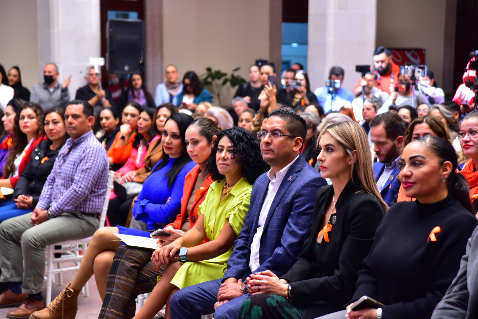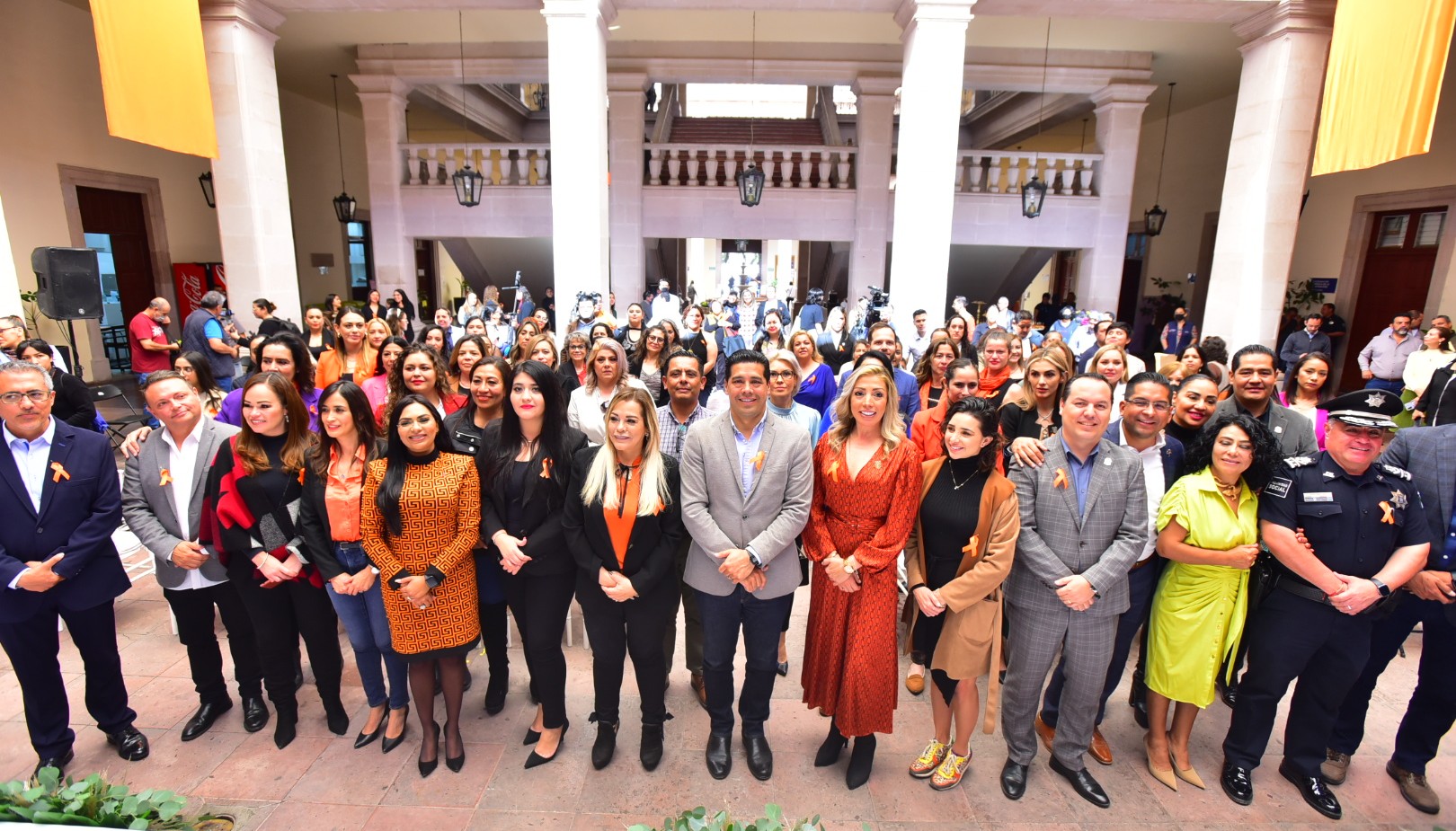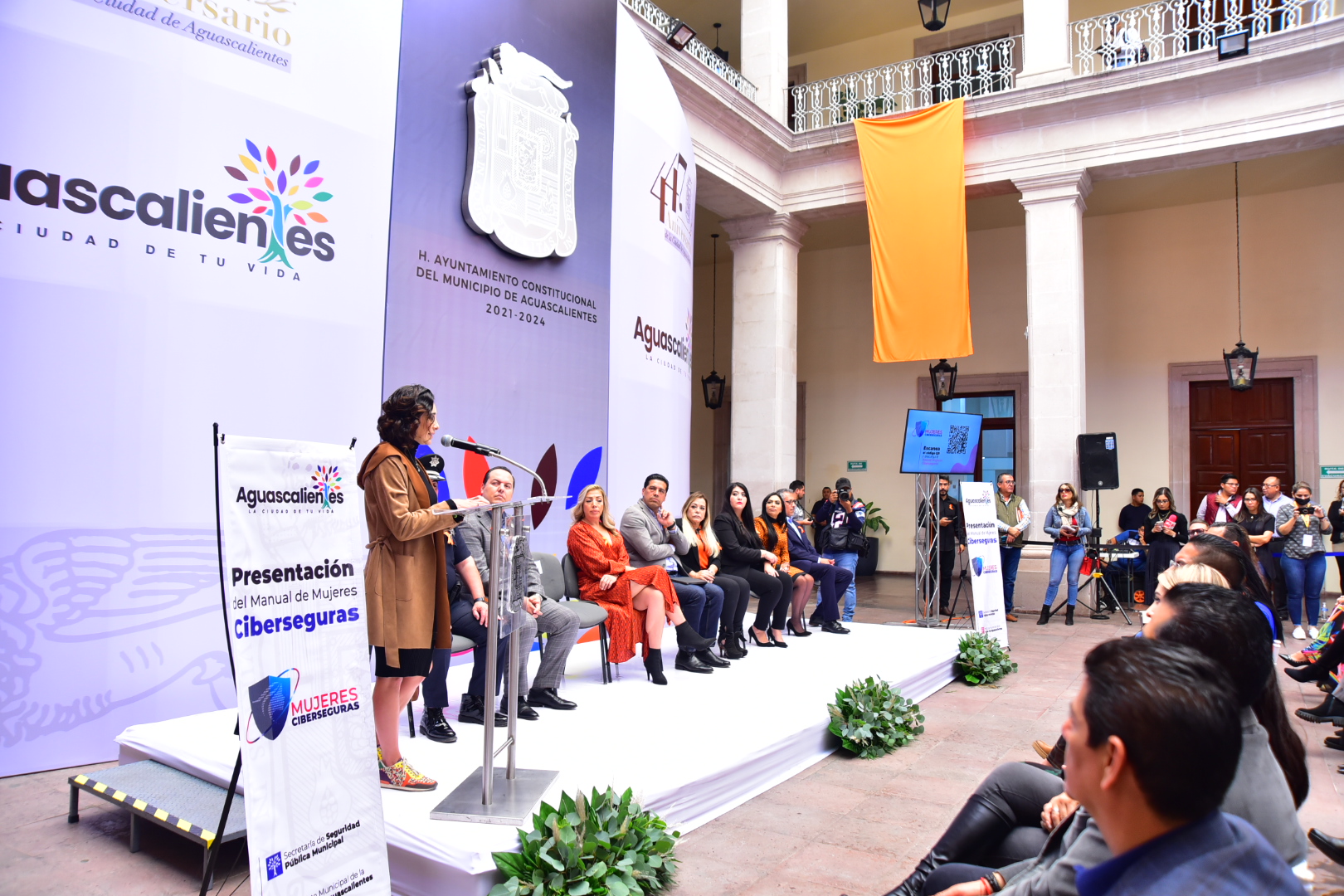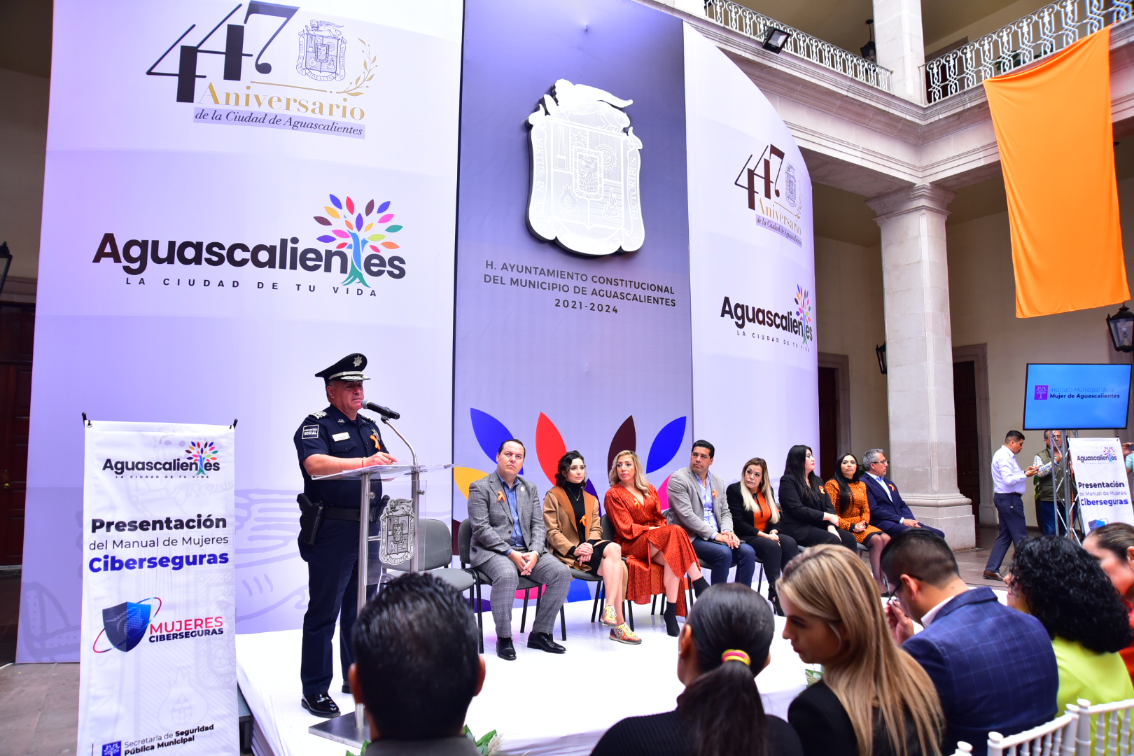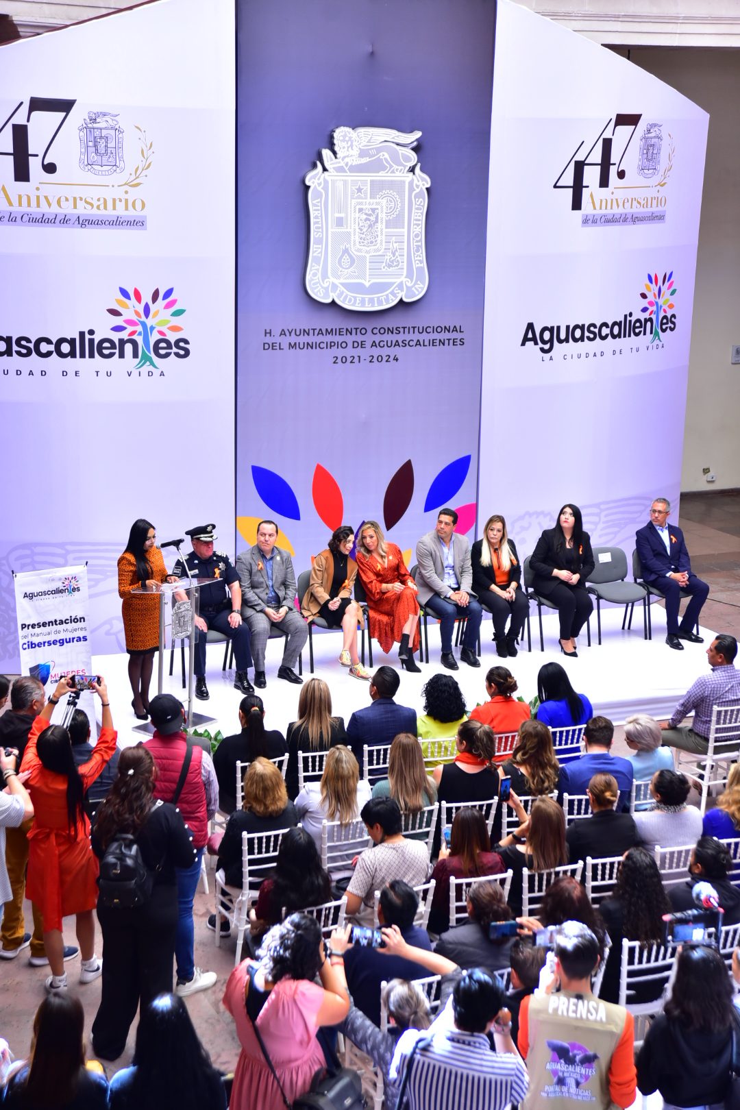 Se contó con la presencia en este evento efectuado en el segundo patio de Palacio Municipal, de la regidora presidenta de la Comisión de Igualdad y Género, Marisol Barrón Betancourt; Jaime Gerardo Beltrán Martínez, secretario del H. Ayuntamiento y director general de Gobierno; Patricia Castillo Castillo, titular de la Secretaría de Desarrollo Social del Gobierno del Estado; Patricia Cárdenas Delgado, directora del Instituto Aguascalentense para las Mujeres; Alfonso Linares Medina, coordinador del Comité de Promoción del Delito y las Violencias de la Mesa Ciudadana de Seguridad y Justicia en Aguascalientes; la encargada de la Unidad de Inteligencia Cibernética, Alejandra Chávez Arias; así como integrantes del H. Ayuntamiento, titulares de las diferentes Secretarías, representantes de organizaciones civiles y medios de comunicación.