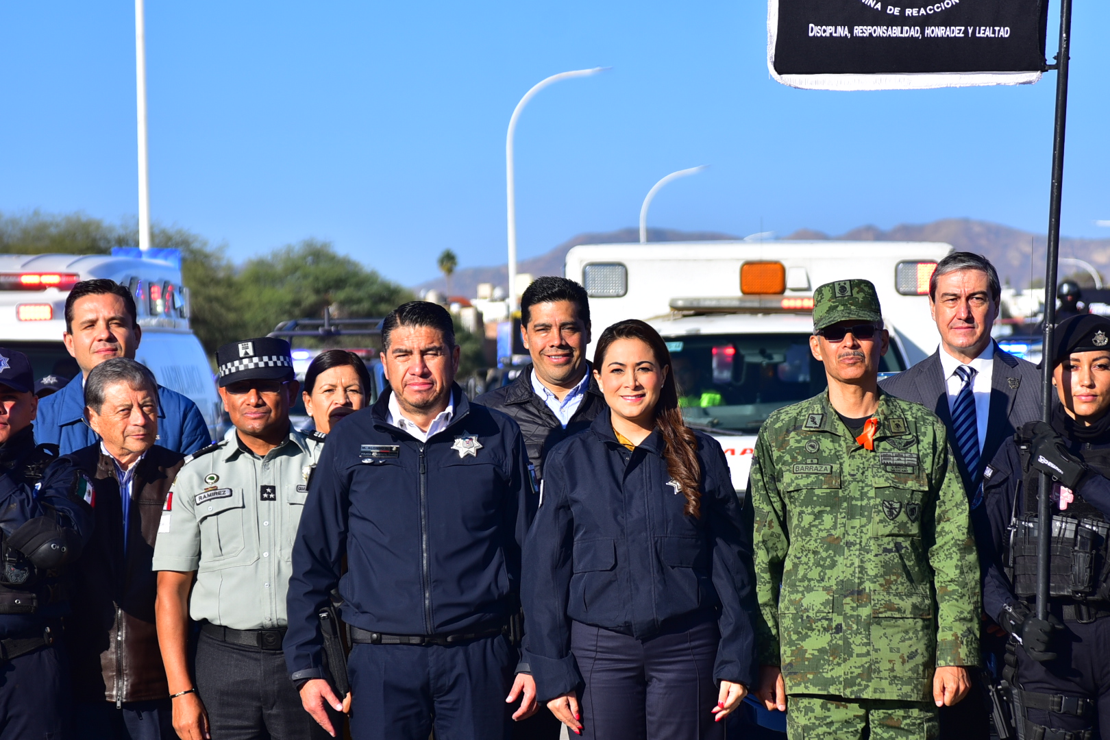 También estuvieron presentes el secretario de Gobierno, Florentino Reyes Berlié; el comandante de la 14a. Zona Militar, Rubén Barraza Rodríguez; el comisionado de la Guardia Nacional e inspector general, David Ramírez Piñón; Cecilia García Reynoso, coordinadora de Servicios de Emergencia; Claudia Lorena Martínez Jiménez, comisaria general de la Policía de Investigación de la Fiscalía General del Estado; Rubén Galaviz Tristán, secretario de Salud; Margarita Gallegos Soto, presidenta municipal de San Francisco de los Romo; Daniel Romo Urrutia, presidente municipal de Calvillo; José Manuel González Mota, presidente municipal de Asientos; Humberto Ambriz Delgadillo, presidente municipal de Pabellón de Arteaga; Antonio Martínez Romo, secretario de Seguridad Pública del municipio de Aguascalientes; Jesús Eduardo Muñoz de León, coordinador estatal de Protección Civil; José Gabino Vázquez Vega, coordinador municipal de Protección Civil; Karla Martorell Moya, presidenta de la Mesa Ciudadana de Seguridad y Justicia; René Villalobos Pérez, subsecretario de Seguridad Pública de San Francisco de los Romo; Georgina Tiscareño de Lira, secretaria de Seguridad Pública de Jesús María; Israel Ibarra Luévano, director de Seguridad Pública y Vialidad de Cosío; María Esthela Valadez, secretaria del Ayuntamiento de El Llano, y Axel Armendáriz Silva, secretario del Ayuntamiento de Rincón de Romos.