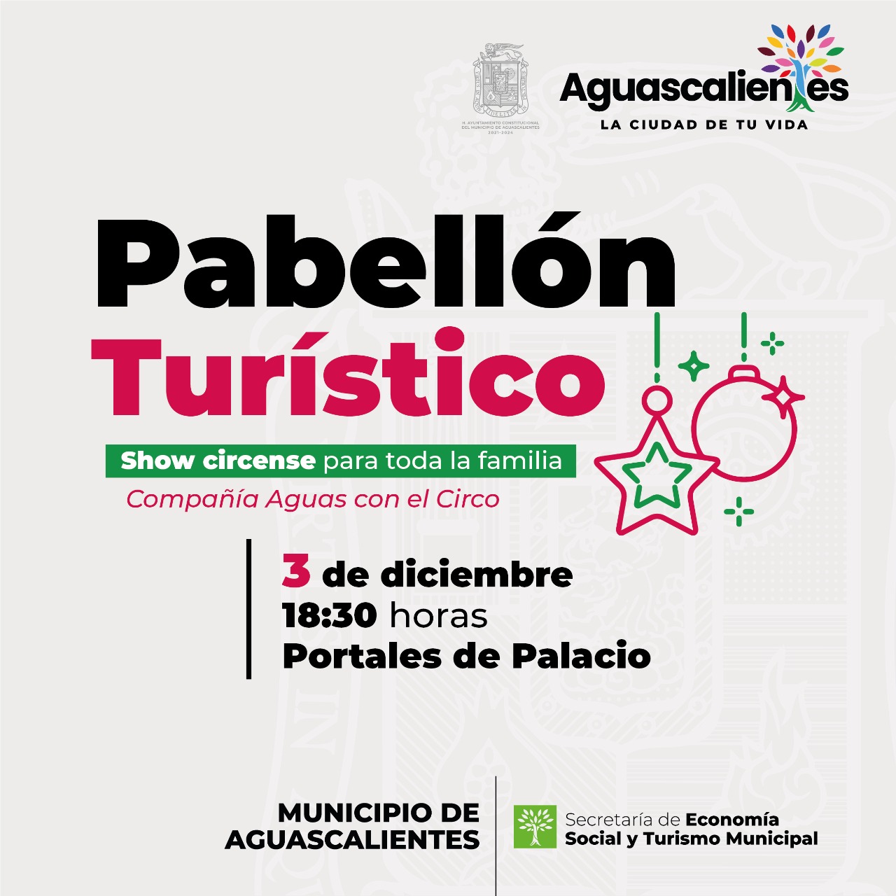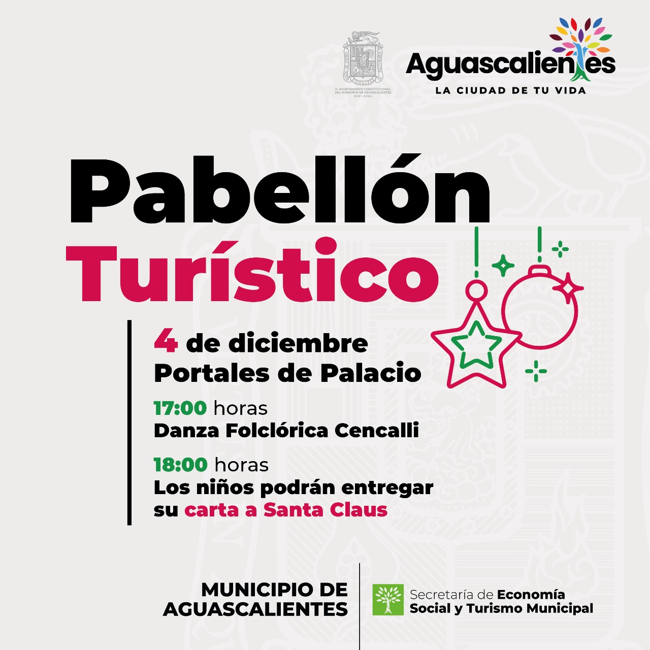 El Municipio de Aguascalientes presentó el programa turístico y cultural navideño 2022 a través del cual se llevarán a cabo actividades para toda la familia, como presentaciones artísticas, pastorelas, villancicos, pabellones comerciales y gastronómicos, en sedes como la Exedra de la Plaza de la Patria, pórtico de Palacio Municipal, colonias y fraccionamientos de las diferentes Delegaciones, en el Corredor Cultural Alameda y en la Línea Verde.