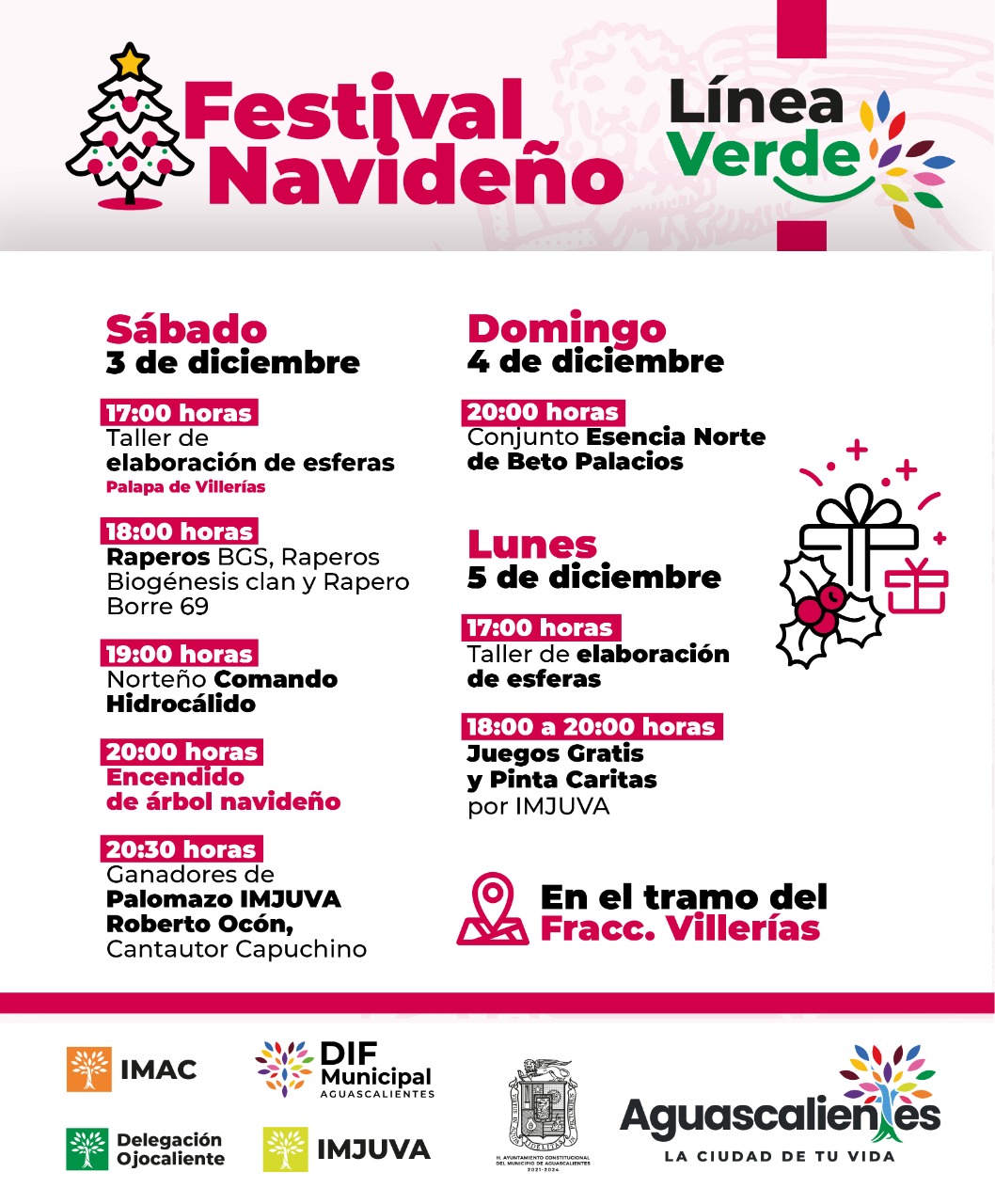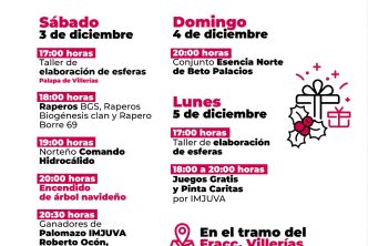 Por su parte, el director del Instituto de Convivencia y Desarrollo Línea Verde, Omar Valdés Reyes, invitó a participar, del 3 al 11 de diciembre, en el Festival Navideño en Línea Verde 2022, en el tramo del Fraccionamiento Villerías, los viernes, sábados y domingos, de 14:00 a 10:00 horas, y los lunes, martes, miércoles y jueves de 16:00 a 10:00 horas.