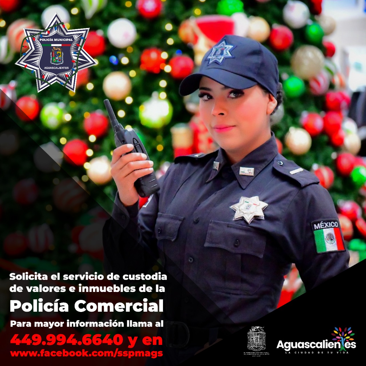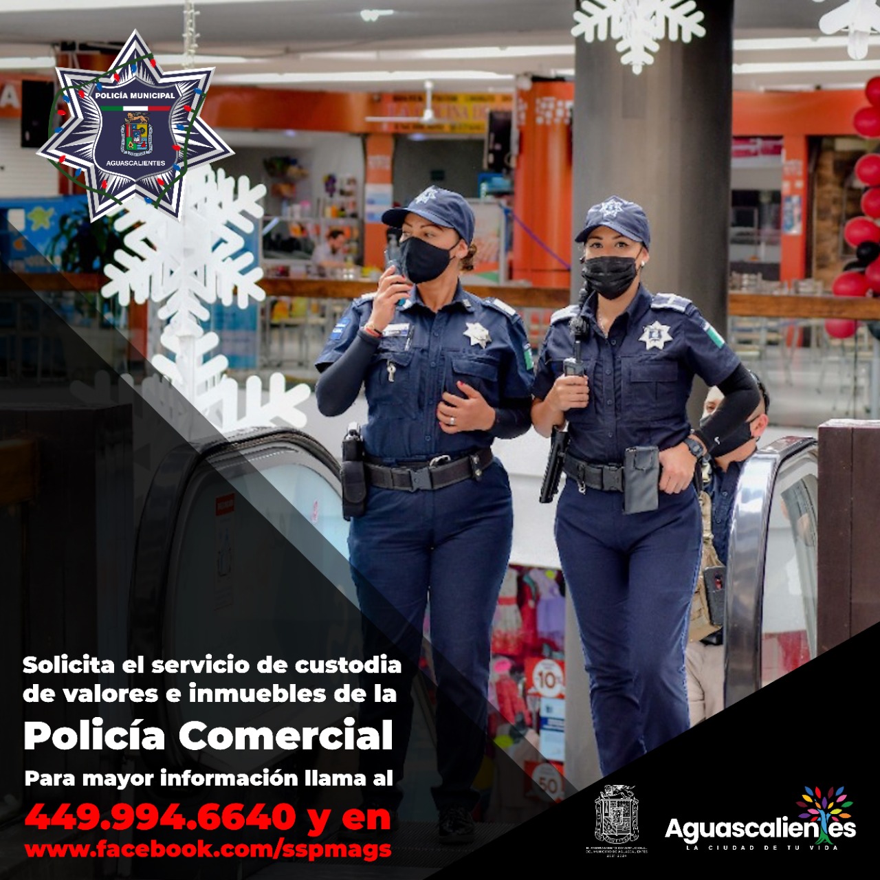 La Secretaría de Seguridad Pública Municipal de Aguascalientes (SSPM) pone a disposición de la población, los servicios de la Policía Comercial para resguardo y protección de empresas, desarrollos habitacionales y negocios diversos, especialmente en esta época en que incrementan las actividades y la afluencia por compras.