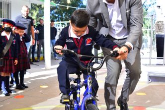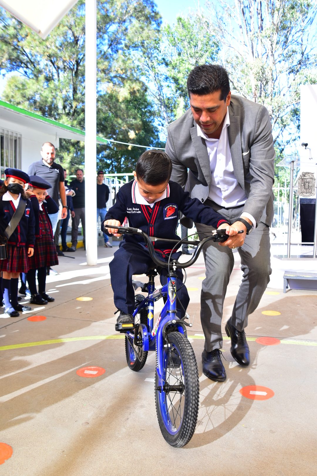 Acompañado por la regidora Ivonne Jacqueline Azcona Ramírez, de los secretarios municipales Edson Camarillo Rodríguez y Miguel Ángel Huízar Botello, titulares de Desarrollo Social y Obras Públicas respectivamente, así como de autoridades del sector educativo, el presidente municipal entregó un kit deportivo al plantel educativo, así como dos bicicletas a los mejores promedios de la escuela, Sebastián Barboza Escareño y Luis Andrés Pérez Estrada.