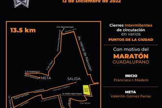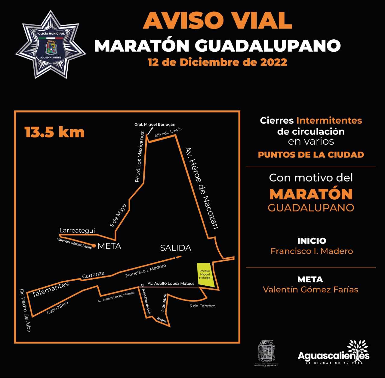 La Secretaría de Seguridad Pública Municipal de Aguascalientes (SSPM) informa que con motivo del Maratón Guadalupano 2022, que se realizará este lunes 12 de diciembre, habrá cierres de circulación vehicular en calles del centro y el primer cuadro de la ciudad de Aguascalientes.
