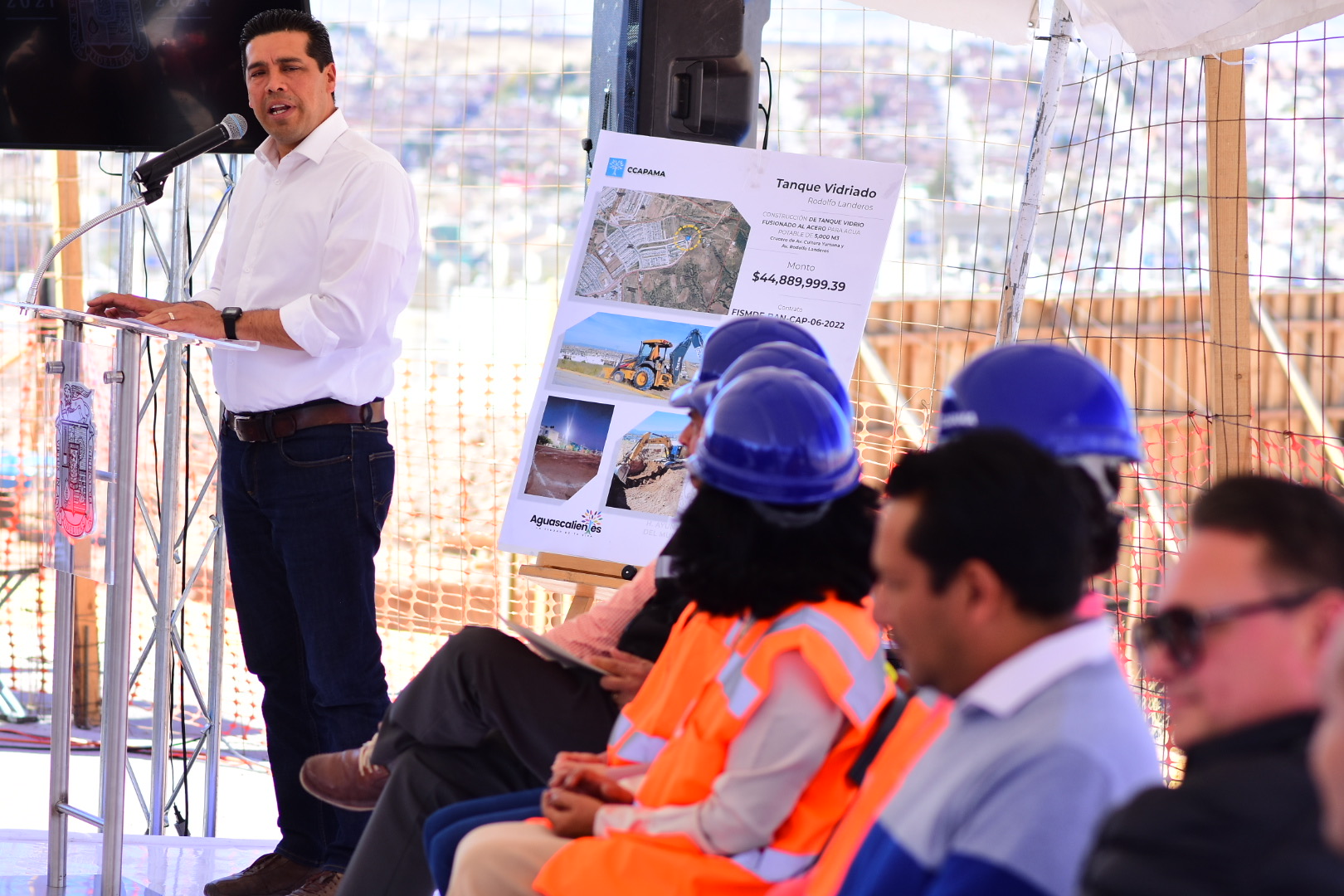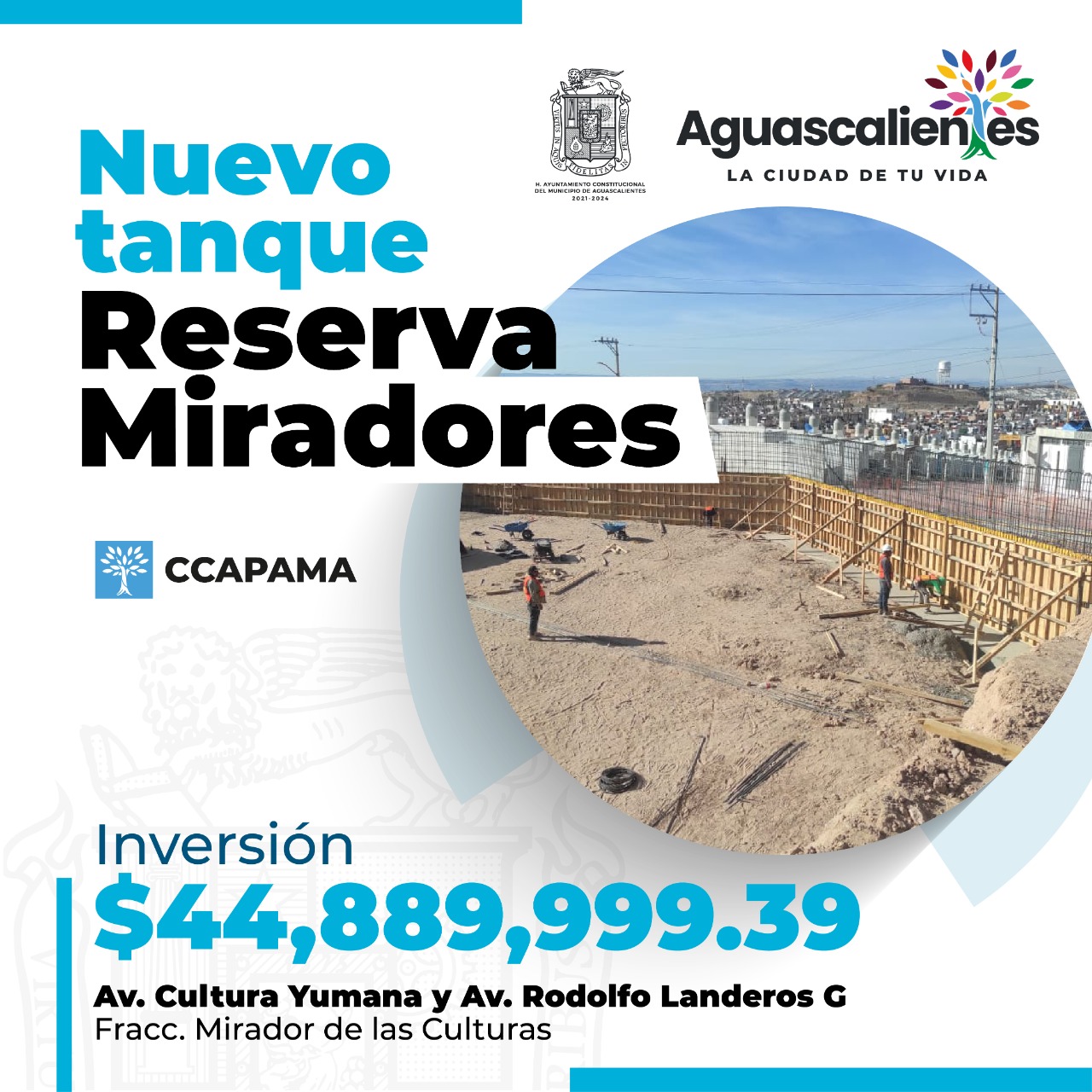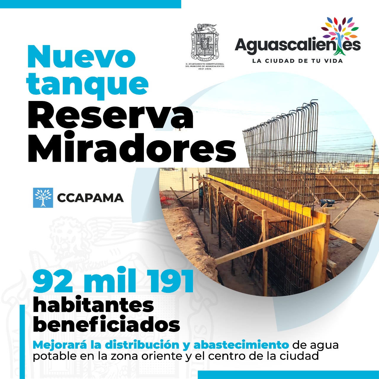 En la recta final del 2022, el presidente municipal de Aguascalientes, Leonardo Montañez, encabezó, en el fraccionamiento Mirador de las Culturas, el arranque de la construcción de uno de los proyectos más importantes en materia hídrica, el mega tanque de acero vidriado del Proyecto Reserva Nororiente, que almacenará 5 millones de litros de agua y beneficiará con mejor abasto y servicio a más de 92 mil habitantes de 14 colonias de esta parte de la capital.