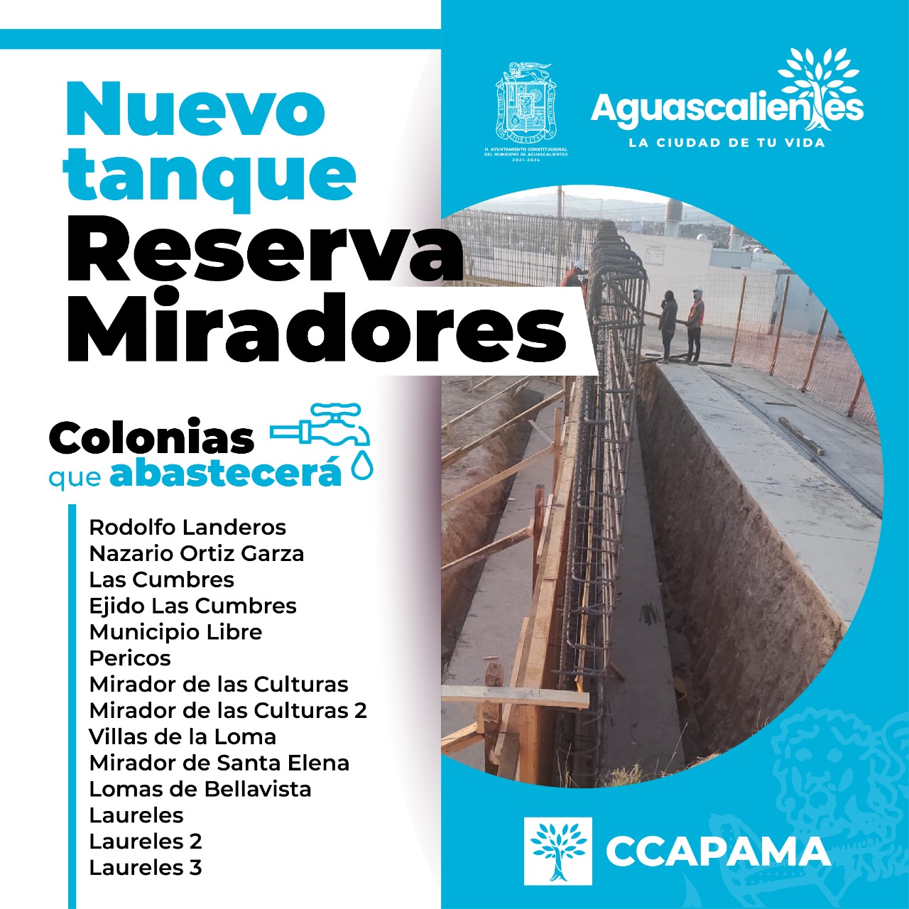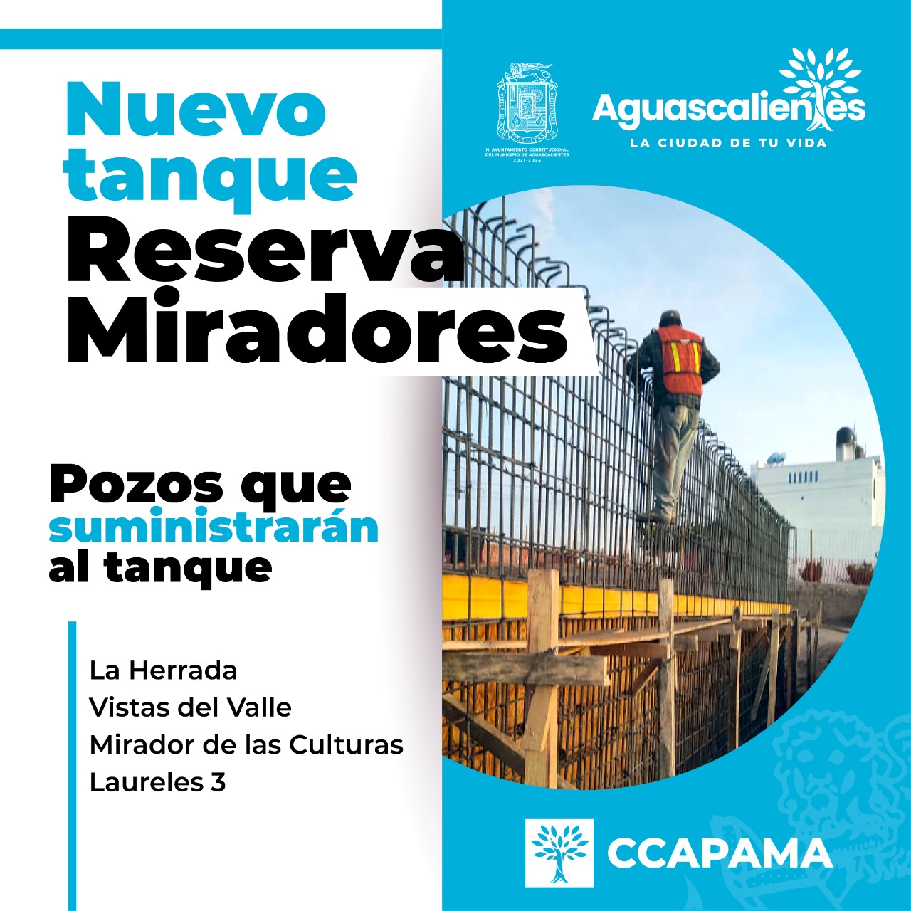 El director técnico de la CCAPAMA, Mauricio Regalado González destacó que la capacidad de este nuevo tanque es de 5 mil metros cúbicos y se va a alimentar de los pozos de La Herrada, Vista del Valle, Mirador de las Culturas y Laureles 3; además se construirá un barandal perimetral.