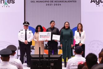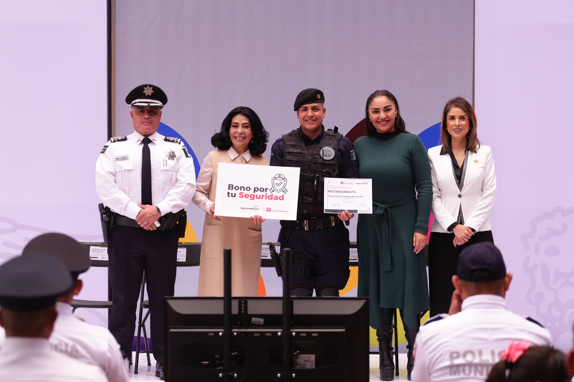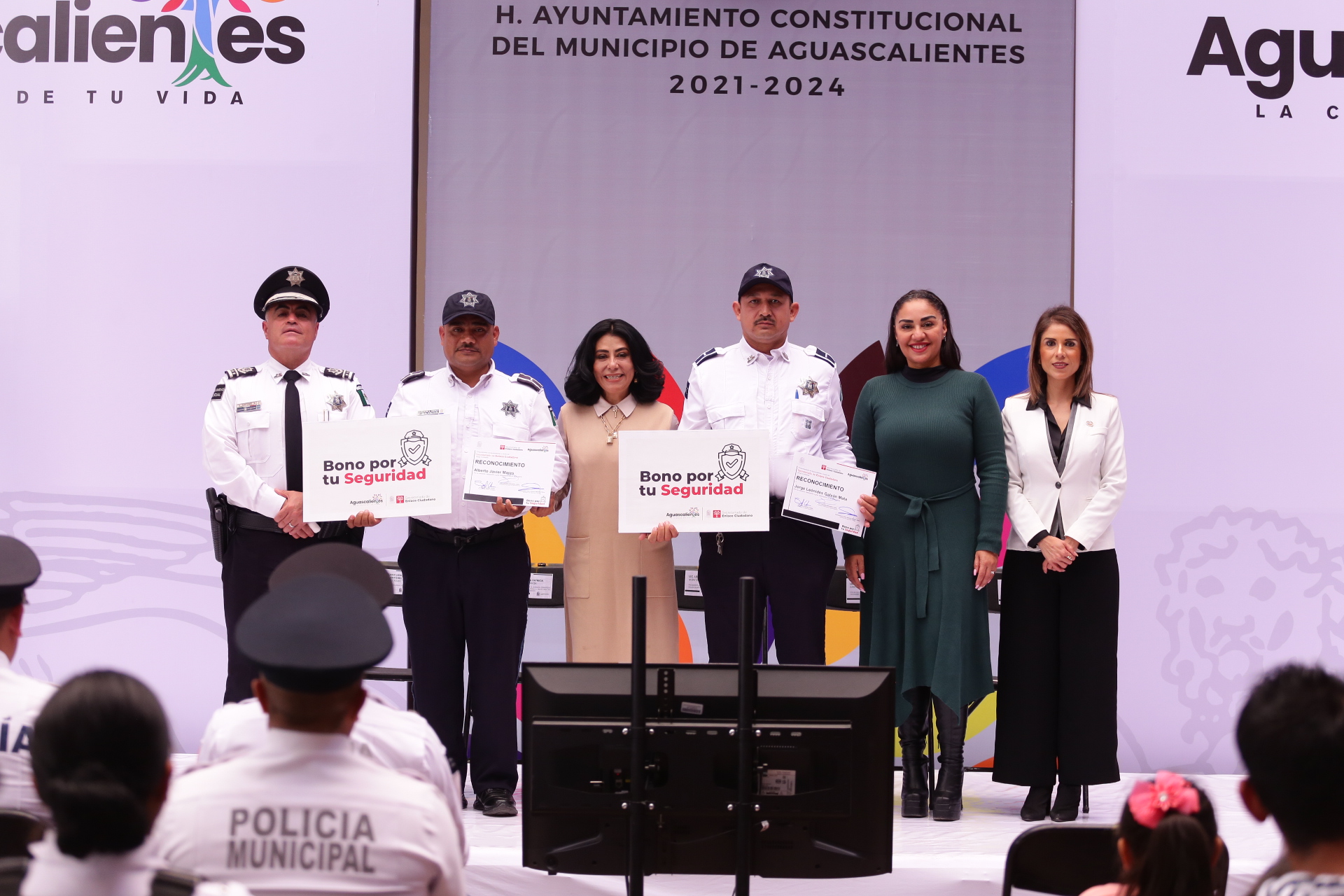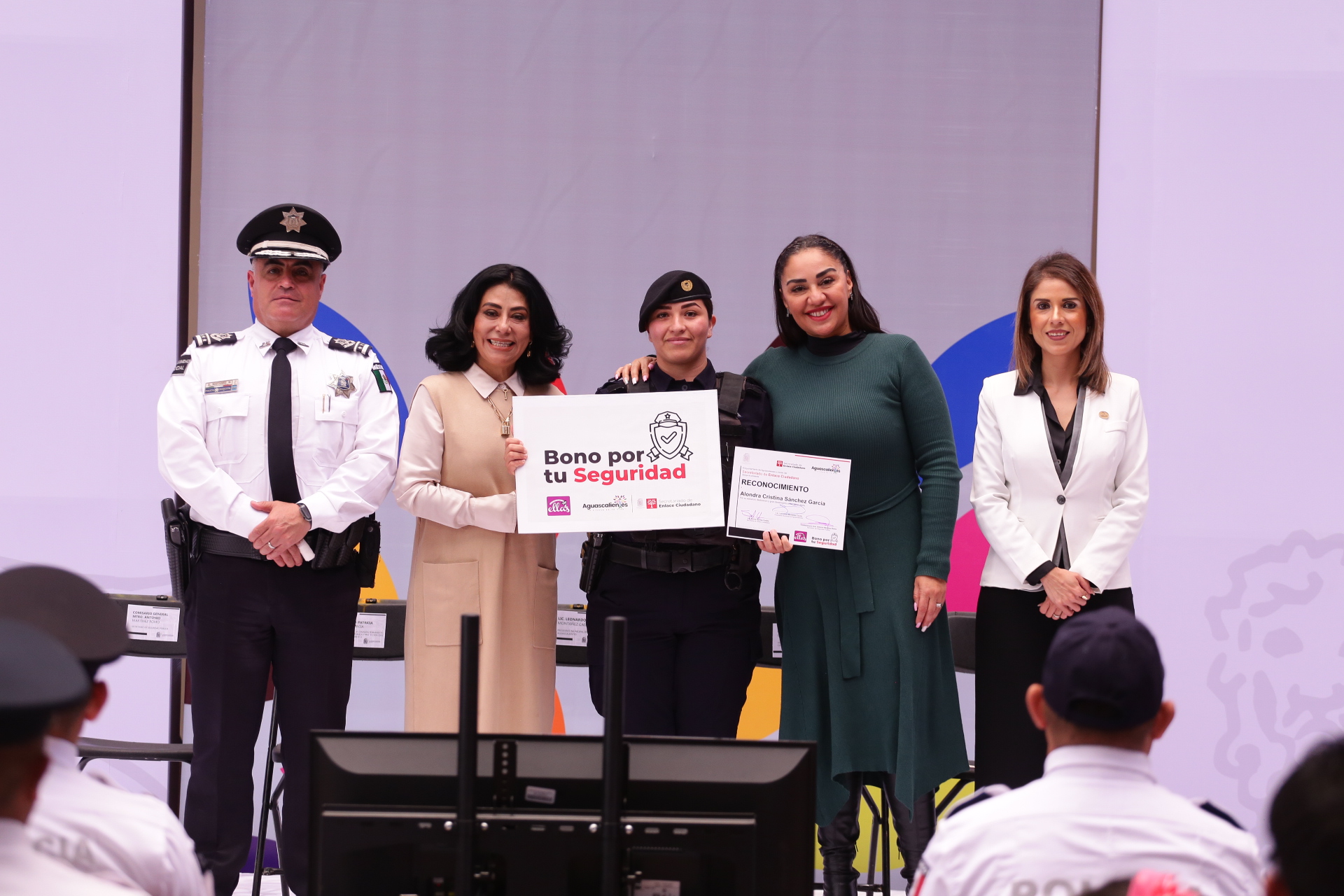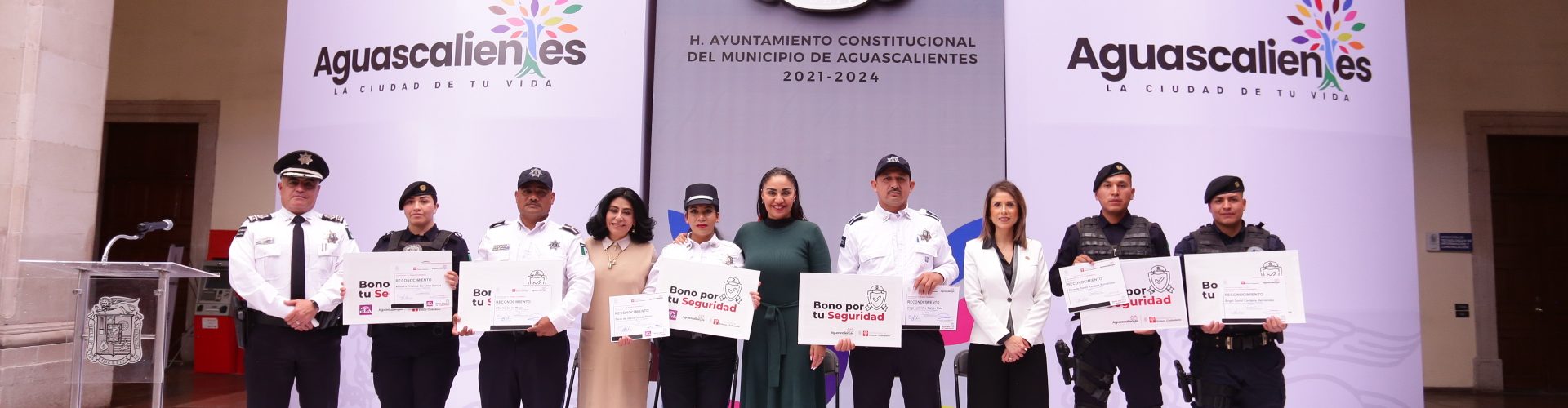 En el marco del Día del Policía, la titular del Secretariado de Enlace Ciudadano, Sylvia Garfias Cedillo encabezó la ceremonia de entrega del «Bono por tu Seguridad», a seis policías municipales destacados por su profesionalismo y vocación de servicio, quienes contribuyen diariamente a mantener a Aguascalientes como una de las ciudades más seguras para vivir.