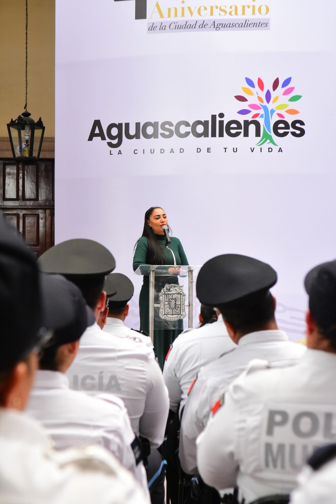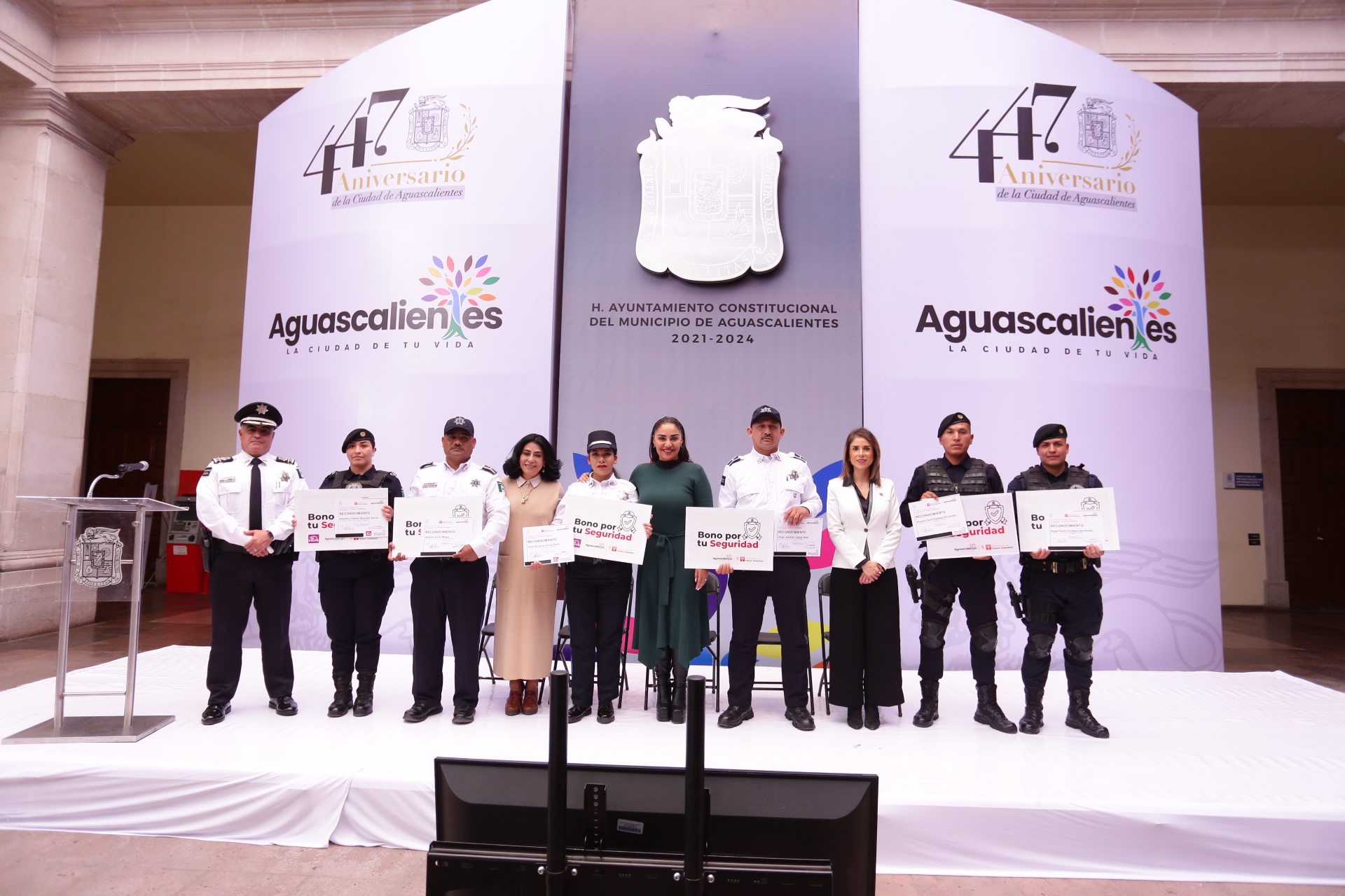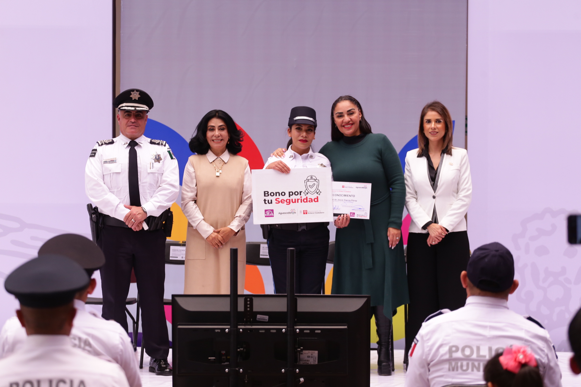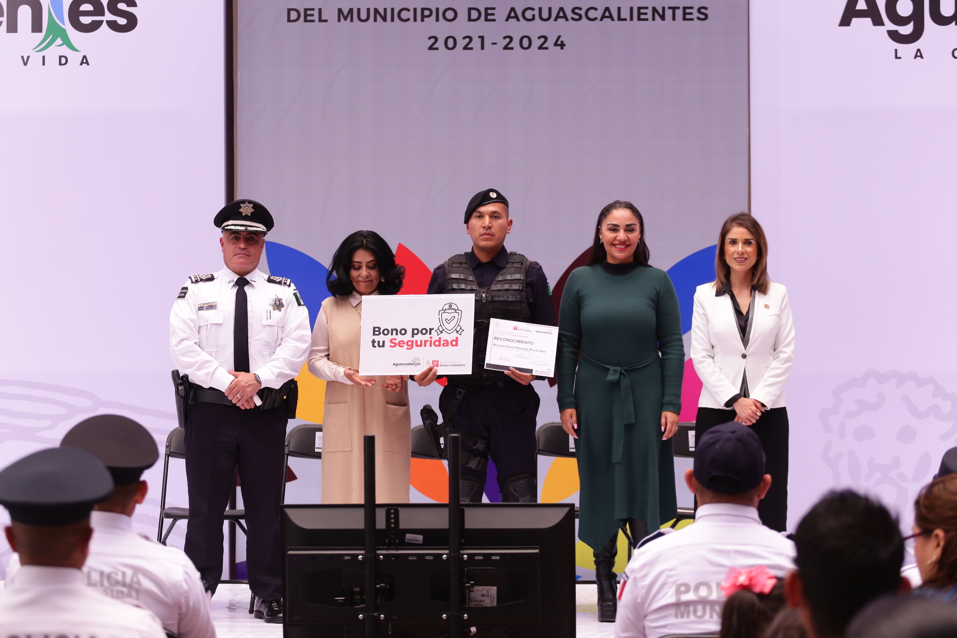 En el marco del Día del Policía, la titular del Secretariado de Enlace Ciudadano, Sylvia Garfias Cedillo encabezó la ceremonia de entrega del «Bono por tu Seguridad», a seis policías municipales destacados por su profesionalismo y vocación de servicio, quienes contribuyen diariamente a mantener a Aguascalientes como una de las ciudades más seguras para vivir.