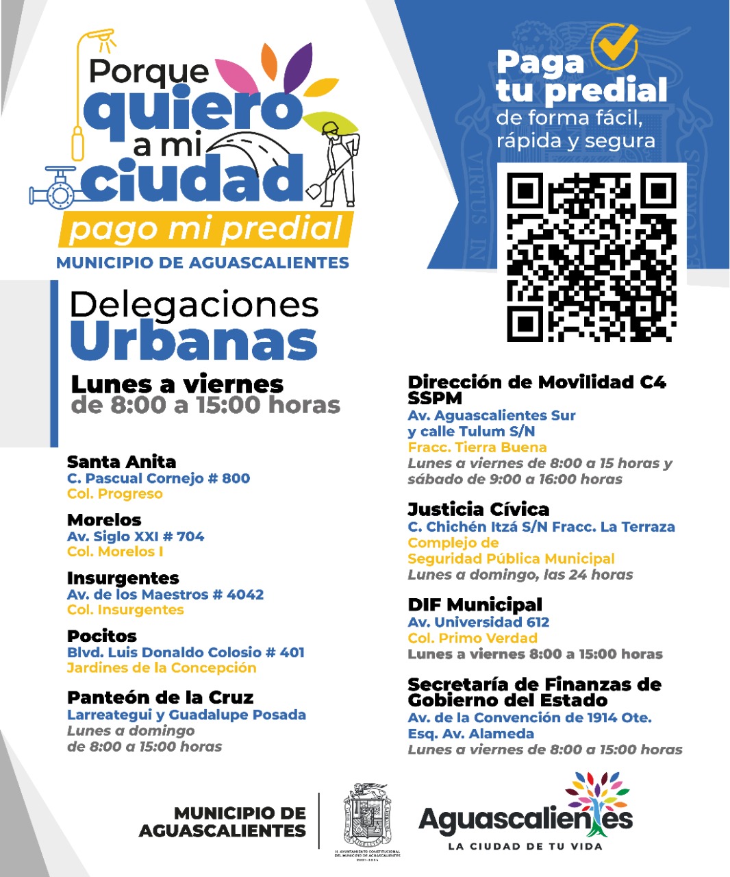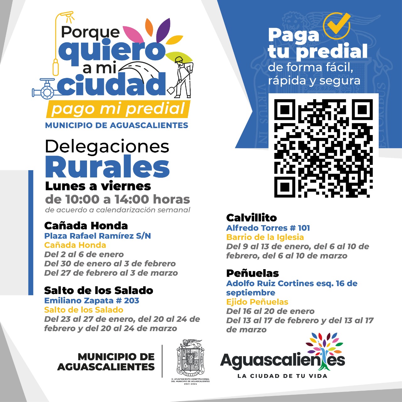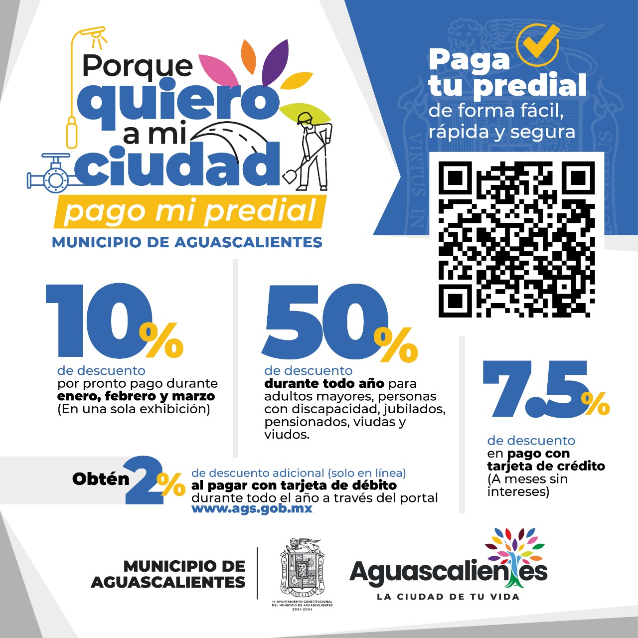 El Municipio de Aguascalientes lanza la campaña “Porque quiero a mi ciudad pago mi predial 2023”, a través de la cual se otorgará un 10 por ciento de descuento por pronto pago en una sola exhibición durante enero, febrero y marzo. El secretario de Finanzas, Sergio Arturo Lozano González, ratificó el agradecimiento a la ciudadanía que paga puntualmente su predial, recursos que se reflejan en mejores obras y servicios públicos de calidad.